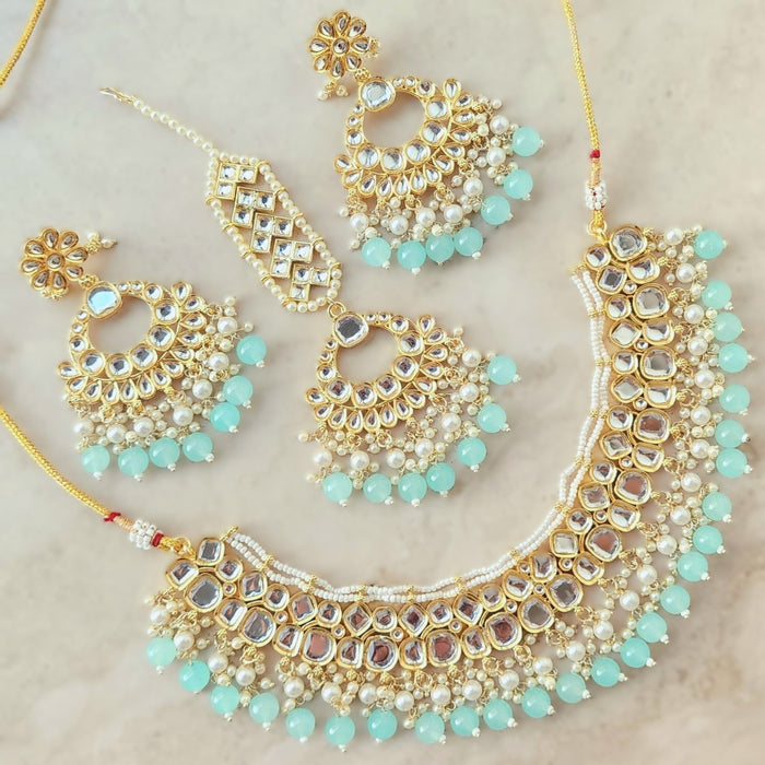 Introducing the exquisite Kundan Necklace Set from Eclat Indian Jewels, a perfect blend of traditional elegance and contemporary design. This stunning set features a beautifully crafted necklace adorned with intricate Kundan stones, meticulously set in a luxurious gold finish. The necklace is complemented by a pair of matching earrings, each measuring 8.8 cm in length, designed to add a touch of sophistication to any ensemble. The earrings and necklace are embellished with pastel blue beads and delicate pearls, creating a harmonious balance of color and sparkle. Ideal for special occasions, this Kundan Necklace Set is a timeless addition to your jewelry collection, exuding grace and opulence with every wear. Embrace the essence of traditional Indian jewelry and buy Indian jewellery online from Eclat Indian Jewels to add a touch of timeless beauty to your collection.