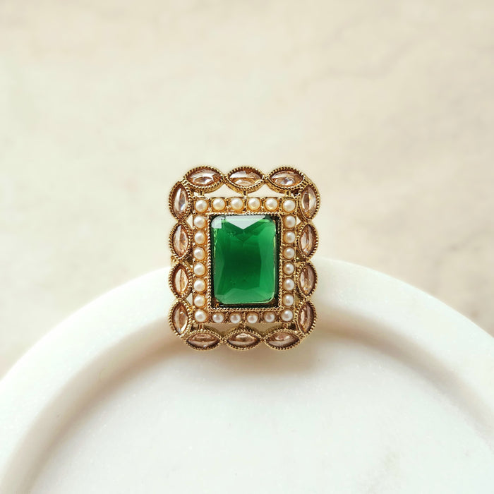 The Dierdre Polki Ring from Eclat Indian Jewels offers a captivating combination of sparkling Polki, white pearly stones and emerald green stone. Ideal for weddings, festivals, or any special day, this jewel adds a regal touch to any outfit. Pair it with other Polki pieces and an ethnic ensemble for a mesmerizing look.