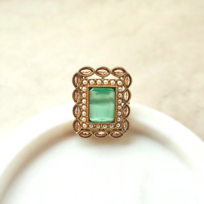 The Dierdre Polki Ring from Eclat Indian Jewels offers a captivating combination of sparkling Polki, white pearly stones and sea green stone. Ideal for weddings, festivals, or any special day, this jewel adds a regal touch to any outfit. Pair it with other Polki pieces and an ethnic ensemble for a mesmerizing look.