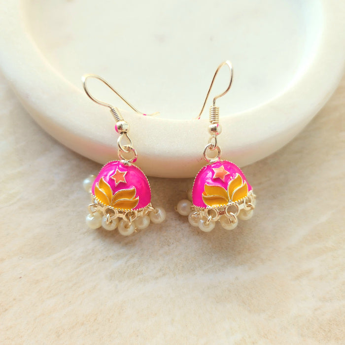 Introducing the exquisite Mini Jhumkas from Eclat Indian Jewels, a perfect blend of traditional charm and modern elegance. These stunning earrings feature a vibrant pink dome adorned with intricate golden floral motifs and a delicate star design, adding a touch of whimsy and sophistication. The base of the jhumkis is embellished with a fringe of lustrous white pearls, creating a beautiful contrast and enhancing the overall allure. The earrings are designed with a gold-toned hook for easy wear and a secure fit. These mini jhumkas are ideal for adding a pop of color and a hint of tradition to any outfit, making them a versatile addition to your jewellery collection. Embrace the essence of traditional Indian jewelry and buy Indian jewellery online from Eclat Indian Jewels to add a touch of timeless beauty to your collection.