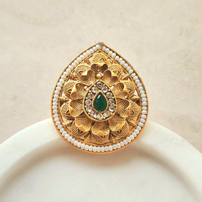 This Ring from Eclat Indian Jewels is a stunning piece of jewellery that is sure to make a statement. With its oxidized gold finish, it exudes a regal aura without being too flashy. The ring is adjustable and features a floral design engraved on an antique drop gold base and finished with white pearls. Whether you want to achieve a subtle, elegant look or stand out from the crowd, this ring is the perfect accessory. Wear it alone or pair it with other antique jewellery to create a magnificent ensemble.