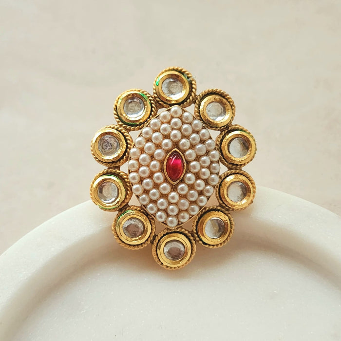 The Dierdre Kundan Ring from Eclat Indian Jewels offers a captivating combination of sparkling Kundan, white pearly stones and red drop stone. Ideal for weddings, festivals, or any special day, this jewel adds a regal touch to any outfit. Pair it with other Kundan pieces and an ethnic ensemble for a mesmerizing look.