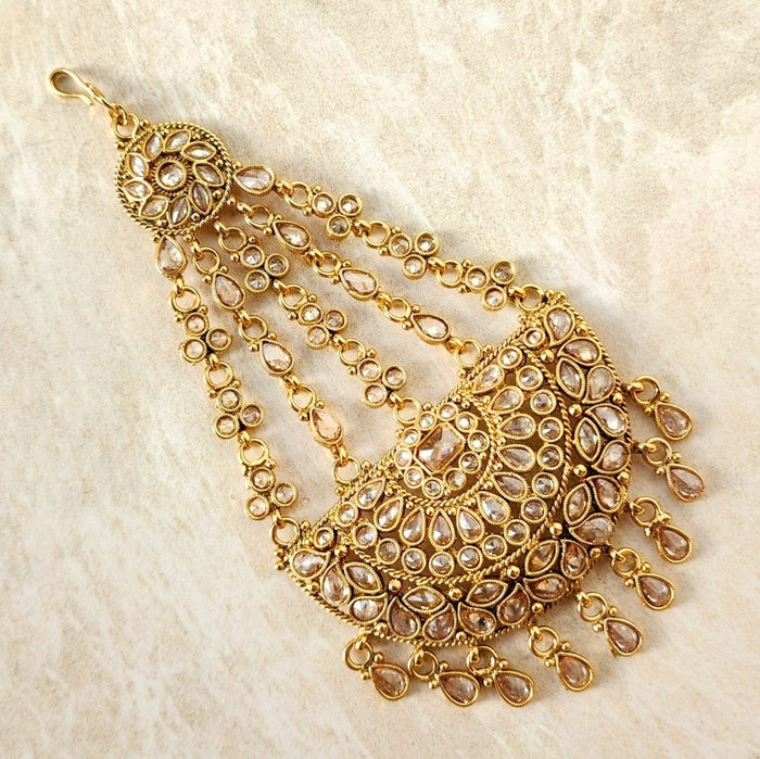 Eclat Indian Jewels presents an exquisite Polki Gold Passa that embodies the grandeur of traditional Indian jewelry design. Crafted with precision, this stunning hair ornament features radiant Polki stones set in a lustrous gold finish. The elaborate arrangement of these polki creates a majestic appeal, while the delicate strands add movement and grace to this timeless piece. Ideal for brides and anyone looking to add a touch of regal elegance to their ensemble, this Passa is sure to turn heads at any festive occasion. 🌟