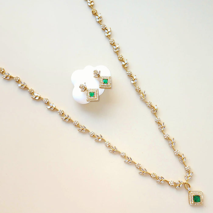 Step into subtle sophistication with our Green Amethyst Luxe Necklace Set, a graceful ensemble from Eclat Indian Jewels that blends delicate design with radiant sparkle. This gold-toned long necklace features a flowing chain adorned with leaf and floral motifs, leading to a square pendant set with a deep green gemstone at its center. Surrounding it are shimmering CZ diamond simulants, offering the brilliance of real diamonds in a lightweight, wearable form.