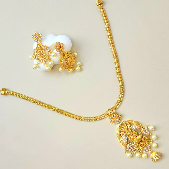 Celebrate the timeless beauty of South Indian heritage with this exquisite necklace set, featuring a majestic pendant and matching earrings. Studded with vibrant kemp stones and shimmering diamond simulants, each piece is a tribute to divine craftsmanship and festive grandeur.