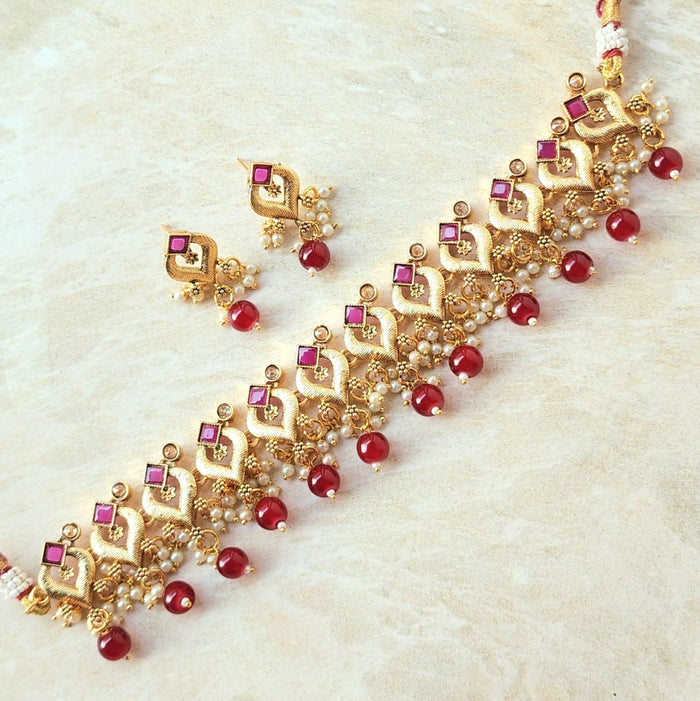 Introducing the exquisite Polki Choker Necklace Set from Eclat Indian Jewels, a perfect blend of traditional elegance and contemporary charm. This stunning set features a beautifully crafted 22k gold-plated choker necklace, intricately studded with dazzling polki stones that exude a timeless allure. The necklace is adorned with vibrant red beads and delicate pearl accents, adding a touch of sophistication to any ensemble. The choker design ensures a graceful fit, making it a statement piece for any special occasion.