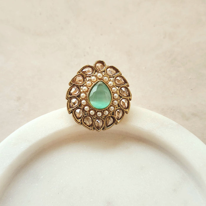 The Polki Pearl Quinn Ring from Eclat Indian Jewels offers a captivating combination of sparkling Polki and sea green drop stones. Ideal for weddings, festivals, or any special day, this jewel adds a regal touch to any outfit. Pair it with other pink and mint green pieces and an ethnic ensemble for a mesmerizing look.