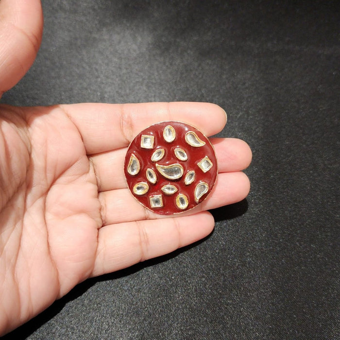 - Design: Round ring with kundan detailing on vibrant red enamel
