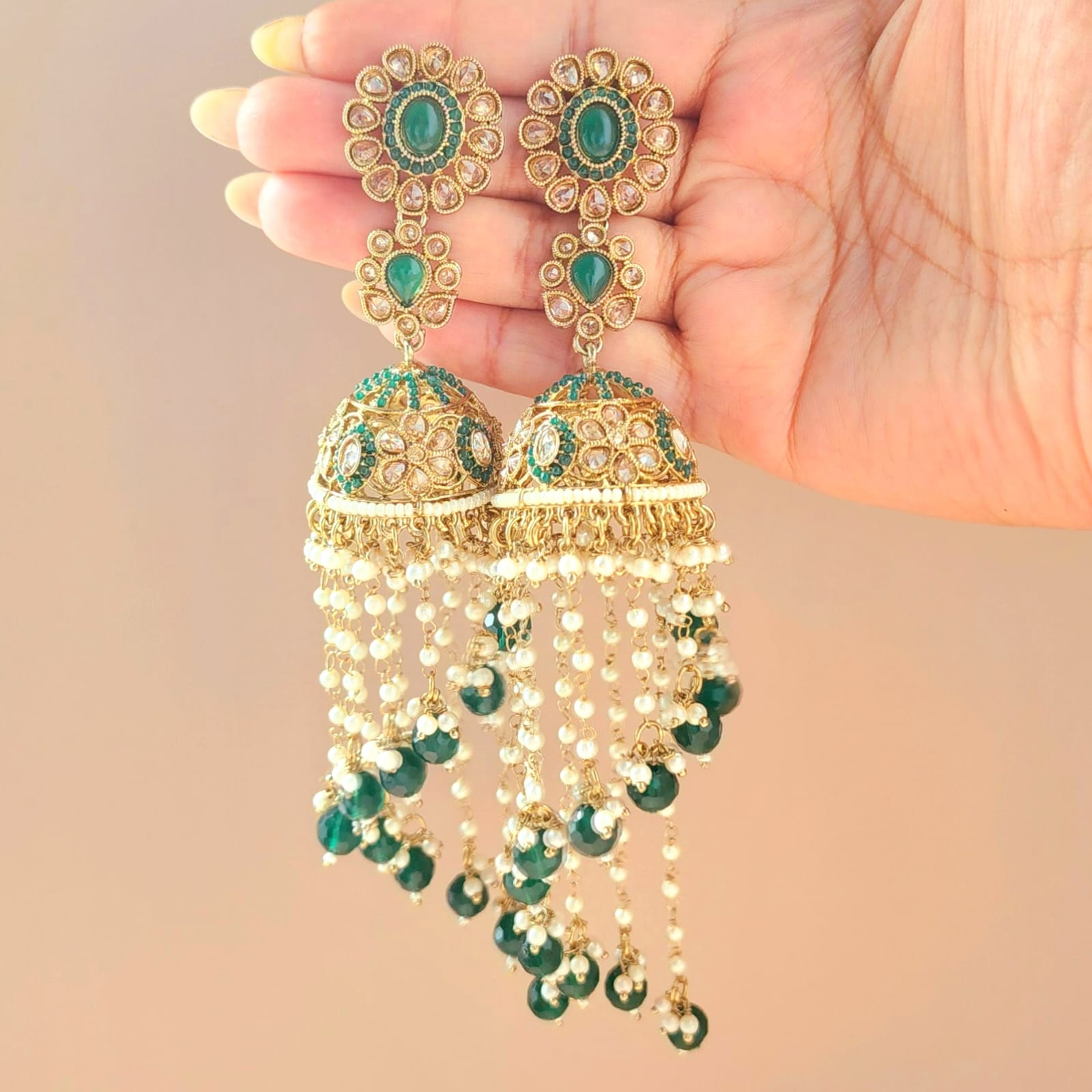 🌿 Statement Silhouette: The earrings cascade dramatically, framing the face with intricate detailing and graceful movement.