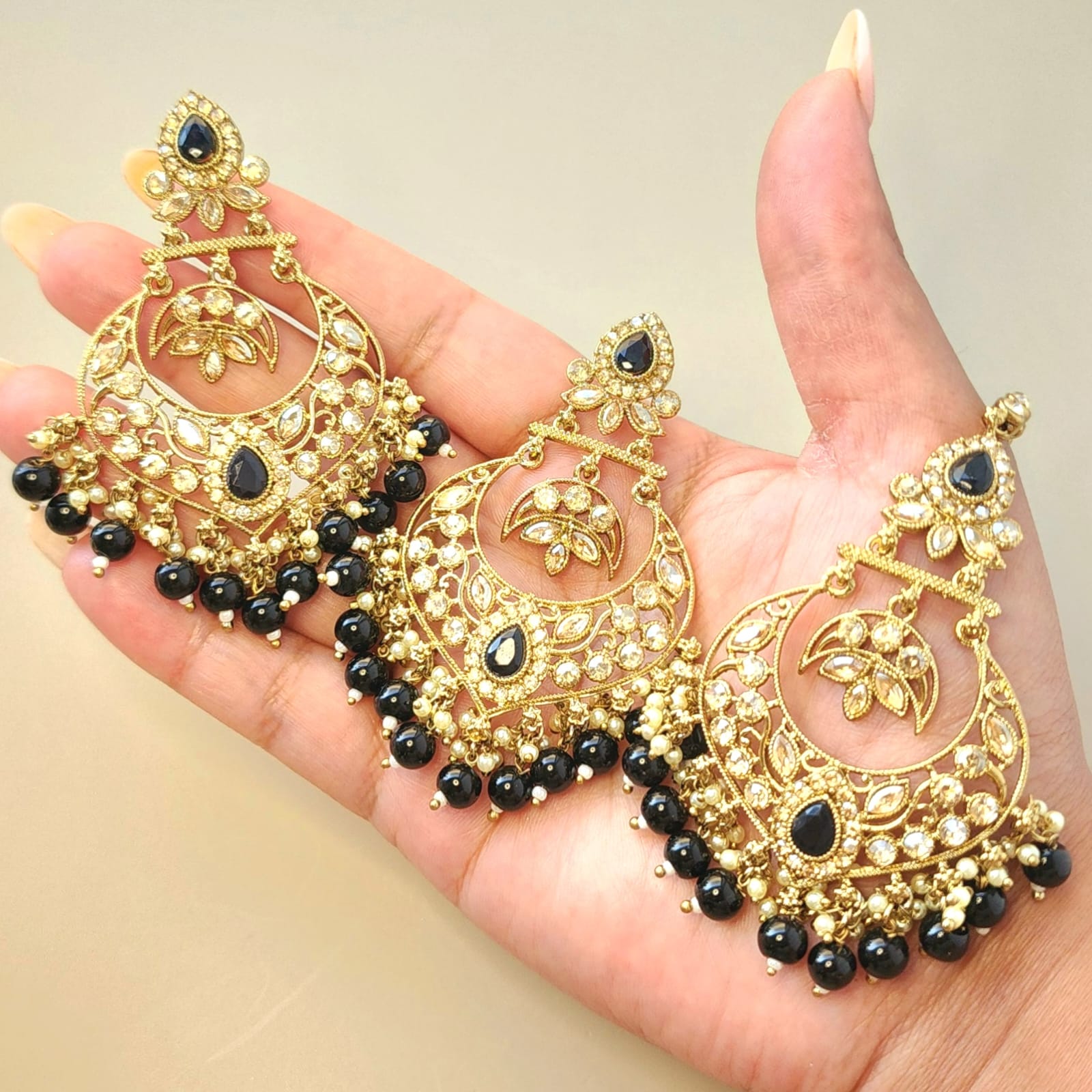 Step into the spotlight with our Noor-e-Raat Polki Maang Tikka Set—a regal ensemble that captures the grandeur of Indian tradition with a contemporary twist. This exquisite set features crescent-shaped earrings and a matching maang tikka, intricately handcrafted in gold-tone finish and adorned with luminous Polki stones.