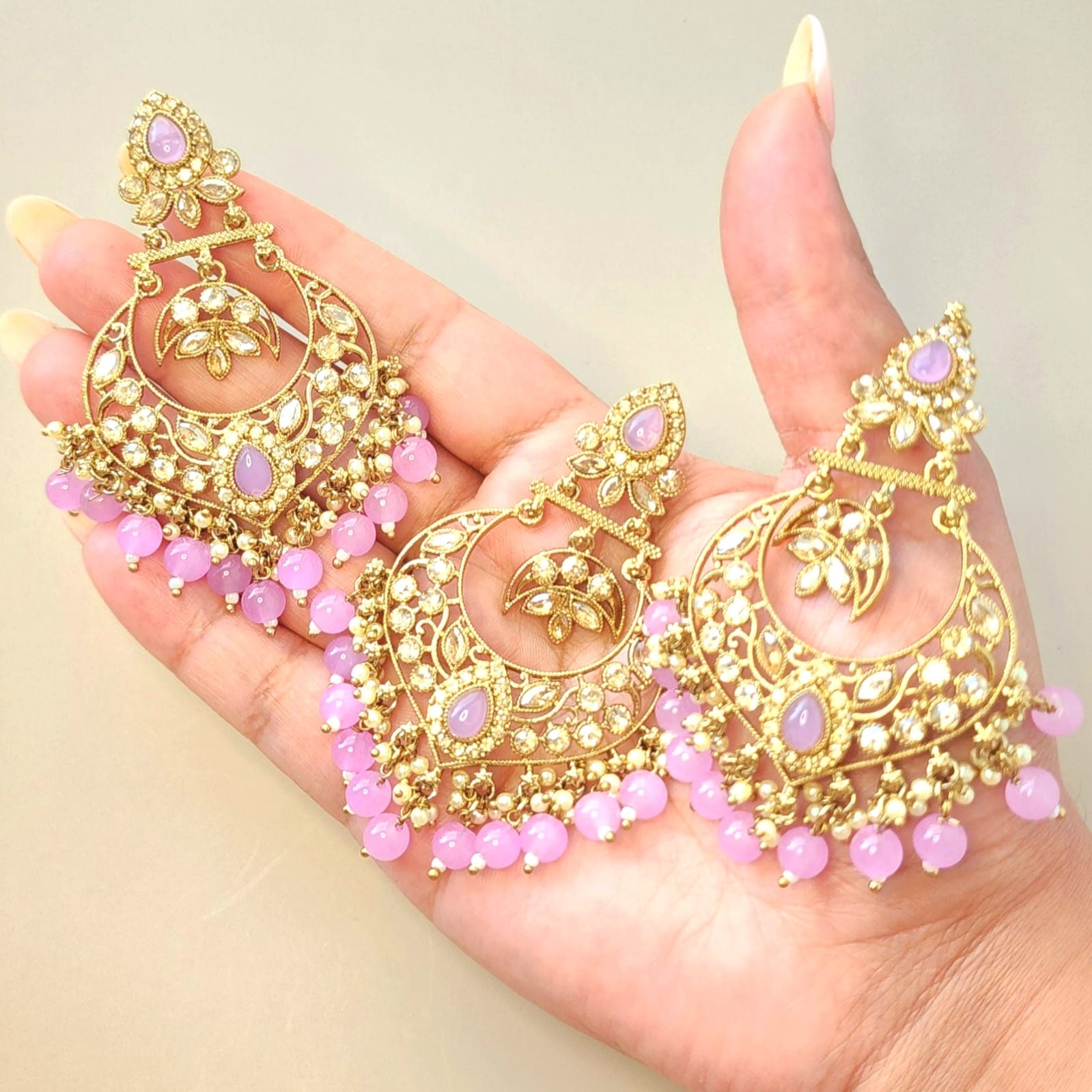 Step into the spotlight with our Light Purple Polki Maang Tikka Set—a regal ensemble that captures the grandeur of Indian tradition with a contemporary twist. This exquisite set features crescent-shaped earrings and a matching maang tikka, intricately handcrafted in gold-tone finish and adorned with luminous Polki stones.