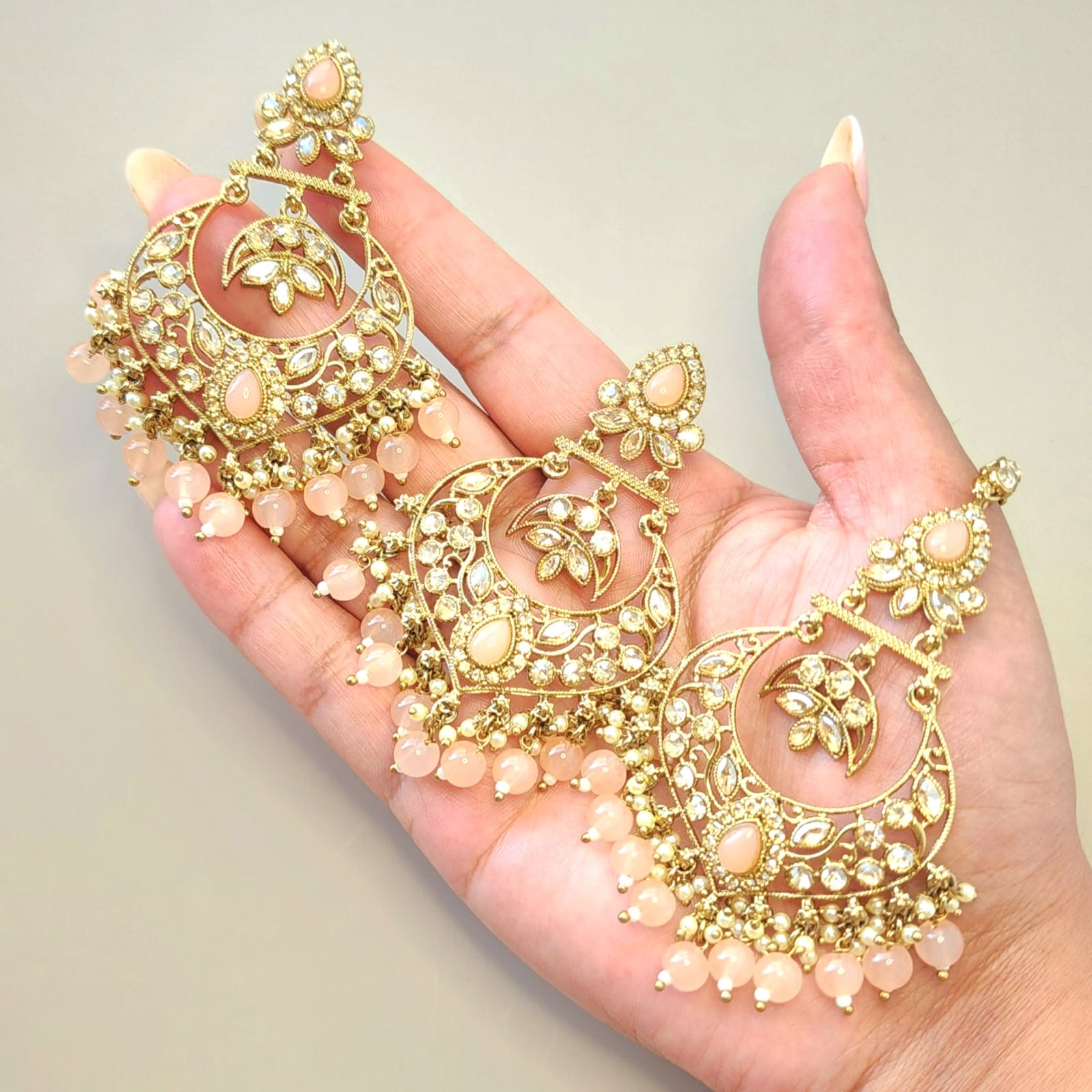 Step into the spotlight with our Peach Polki Maang Tikka Set—a regal ensemble that captures the grandeur of Indian tradition with a contemporary twist. This exquisite set features crescent-shaped earrings and a matching maang tikka, intricately handcrafted in gold-tone finish and adorned with luminous Polki stones.