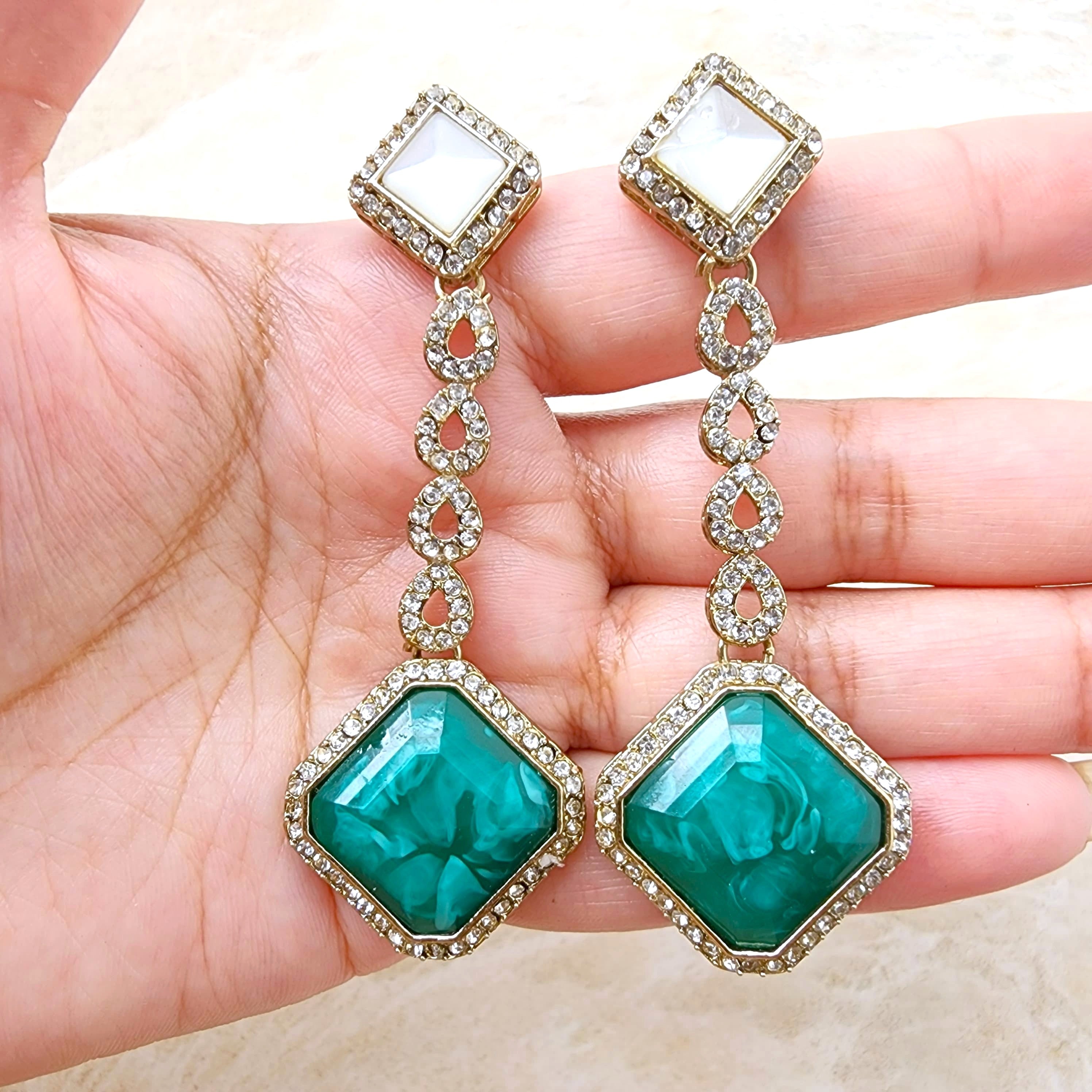 Elevate your style with these stunning geometric elegance earrings from Eclat Indian Jewels. Measuring 7.5 cm in length, these earrings are crafted with exquisite diamond simulants set in a luxurious gold finish. The intricate design features two main decorative elements: a smaller square at the top adorned with a central diamond simulant, and a larger square with rounded edges at the bottom, inlaid with richly colored stones surrounded by smaller diamond simulants.