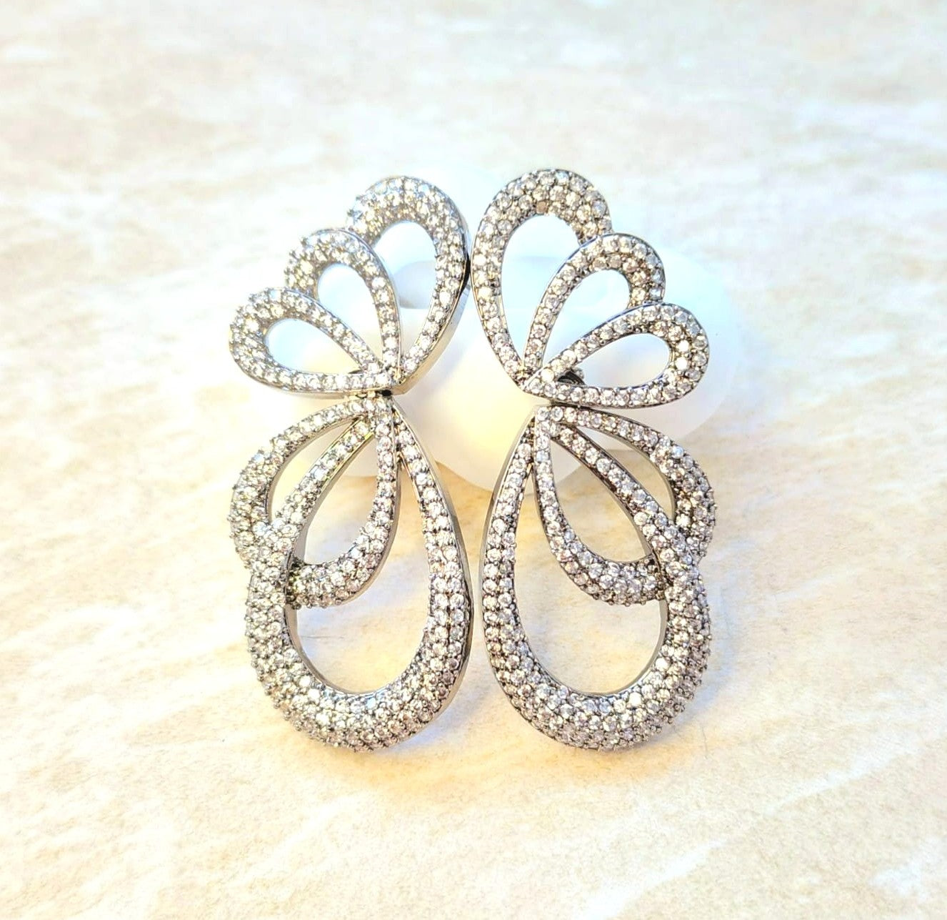 The design unfurls in an elegant, looped bow‑floral silhouette, every curve and edge meticulously set with alternating midnight white stones and clear simulants. This rhythmic contrast creates a play of light that feels as opulent at a wedding soirée as it does at a champagne‑lit gala.