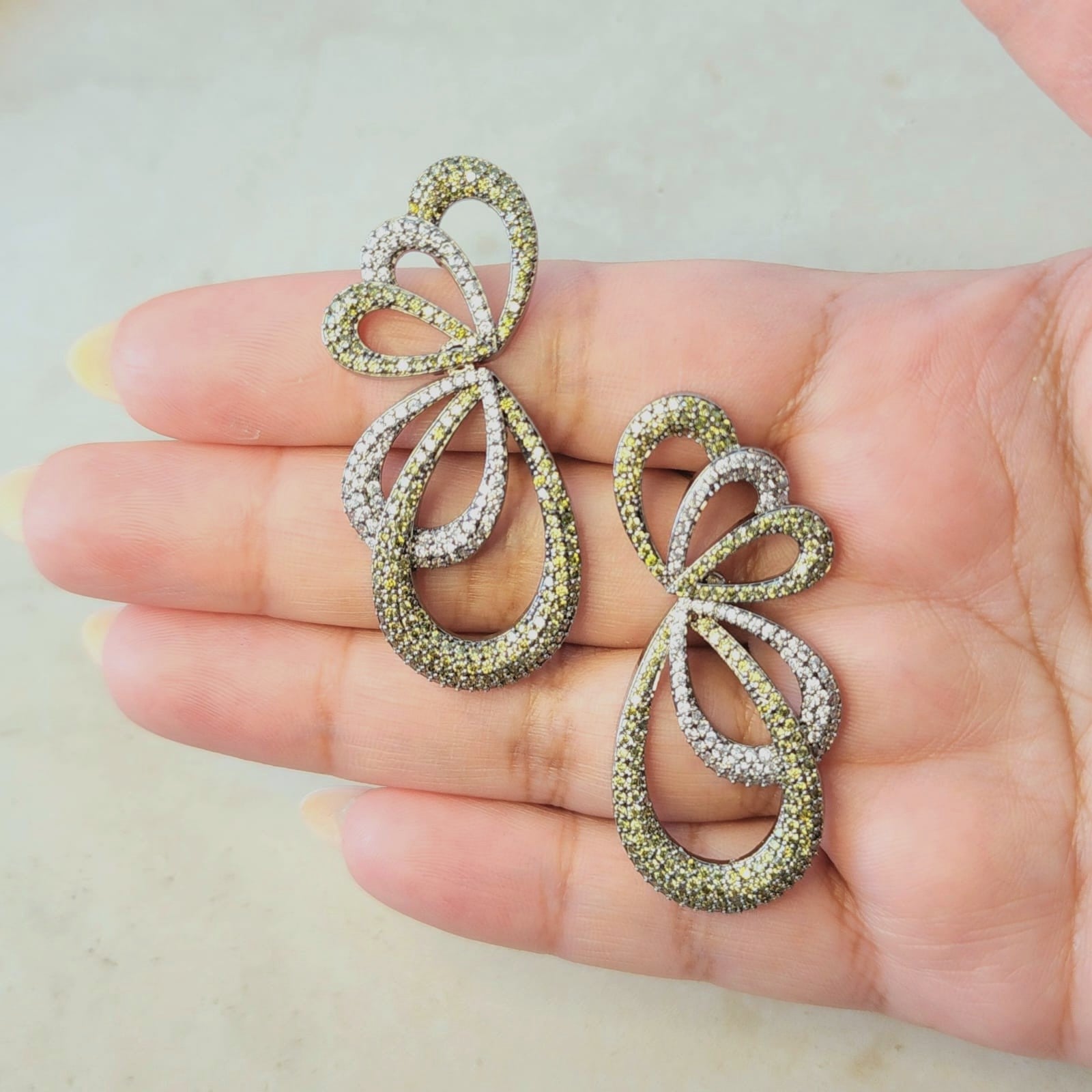 The design unfurls in an elegant, looped bow‑floral silhouette, every curve and edge meticulously set with alternating midnight‑yellow stones and clear simulants. This rhythmic contrast creates a play of light that feels as opulent at a wedding soirée as it does at a champagne‑lit gala.