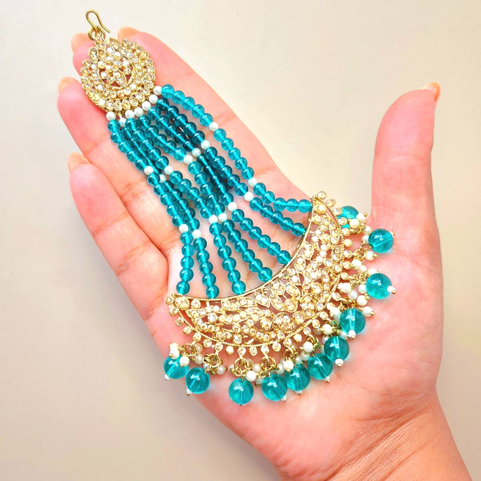 - Necklace: Adorned with intricate gold-tone filigree work and sparkling crystals, this necklace is a true masterpiece. The cascading teal blue beads add a striking contrast, enhancing its traditional appeal with a touch of contemporary elegance. Ideal for anyone wanting to buy Indian jewelry online.