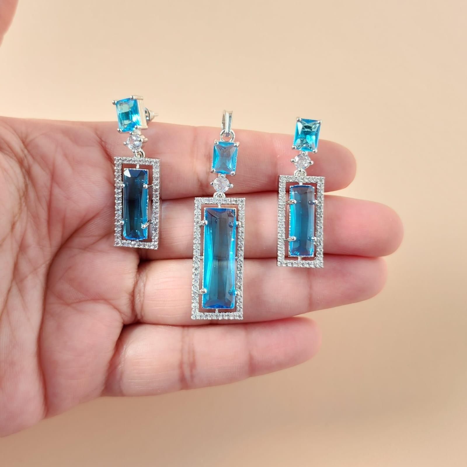 The matching earrings, measuring 4 cm in length, mirror the pendant’s design with a smaller square light blue stone leading into the same regal rectangular drop. Together, the set creates a harmonious balance of color, sparkle, and structure—perfect for those who appreciate understated luxury with a bold twist.