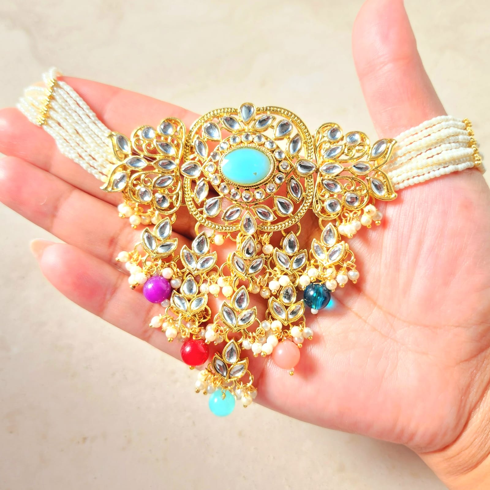 • Choker Necklace: Adorned with intricate Kundan work and a radiant gold finish, this choker is designed to sit gracefully around your neck, adding a touch of regal charm to any outfit.