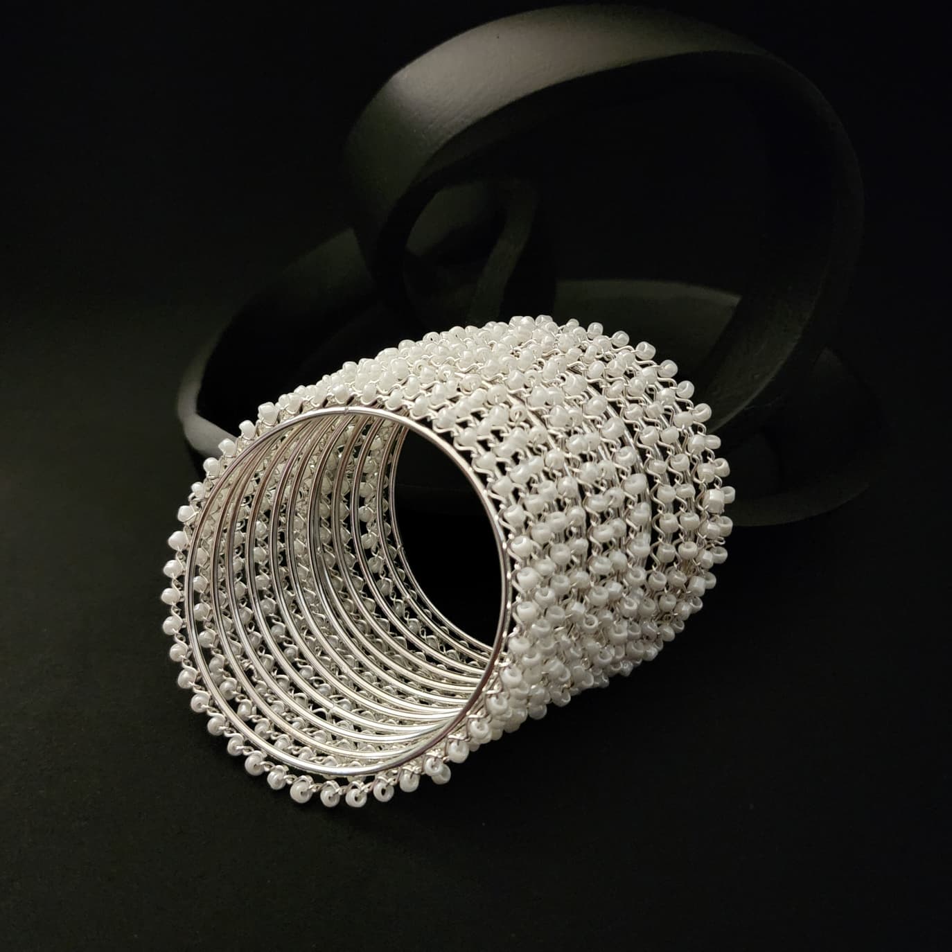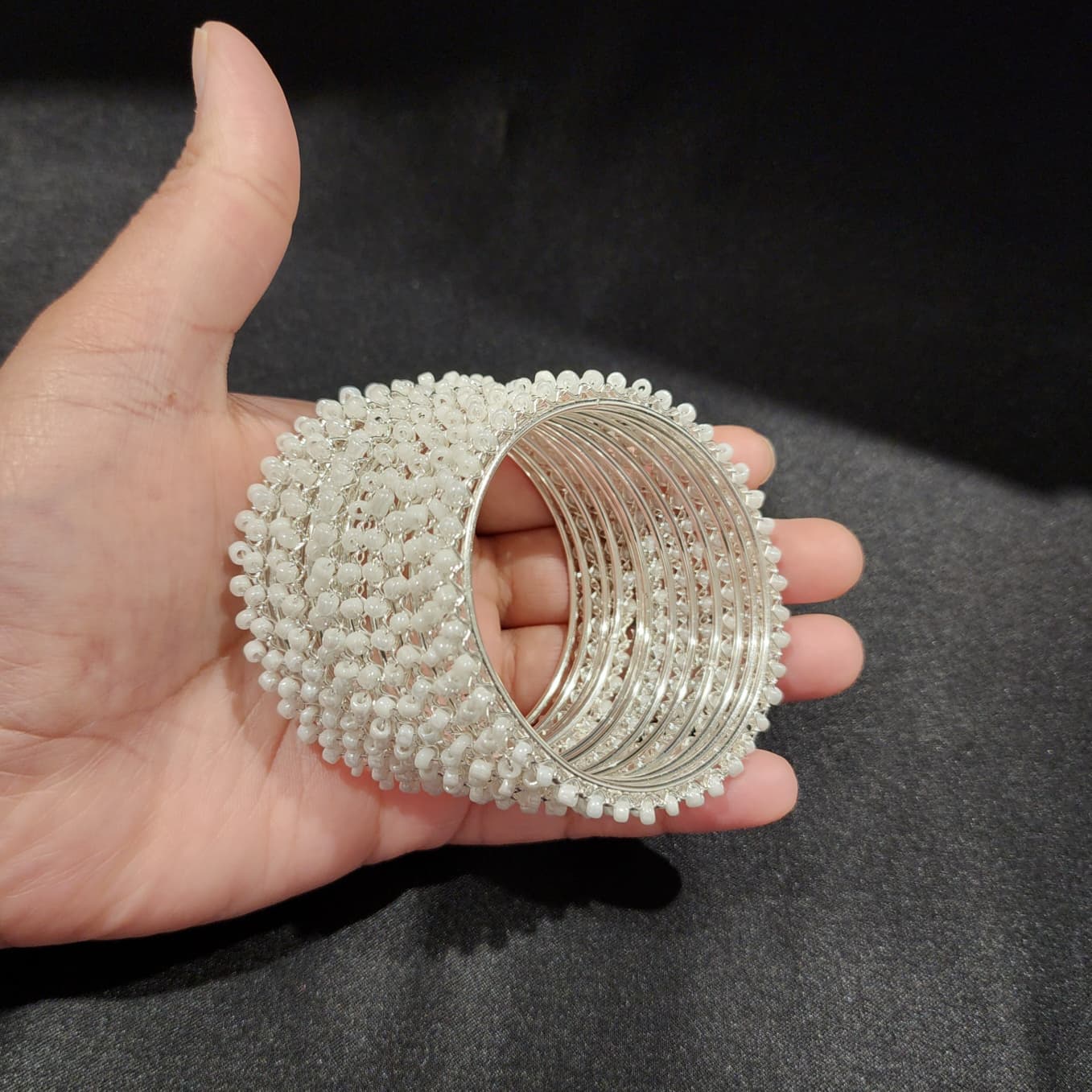 Elevate your ensemble with this exquisite set of 10 bangles, masterfully crafted to embody timeless grace and modern allure. Each bangle gleams in a rich silver finish, adorned with meticulously set sparkling beads that catch the light with every movement. The symmetrical design and intricate detailing reflect the finesse of traditional Indian artistry, reinterpreted for today’s discerning wearer.
