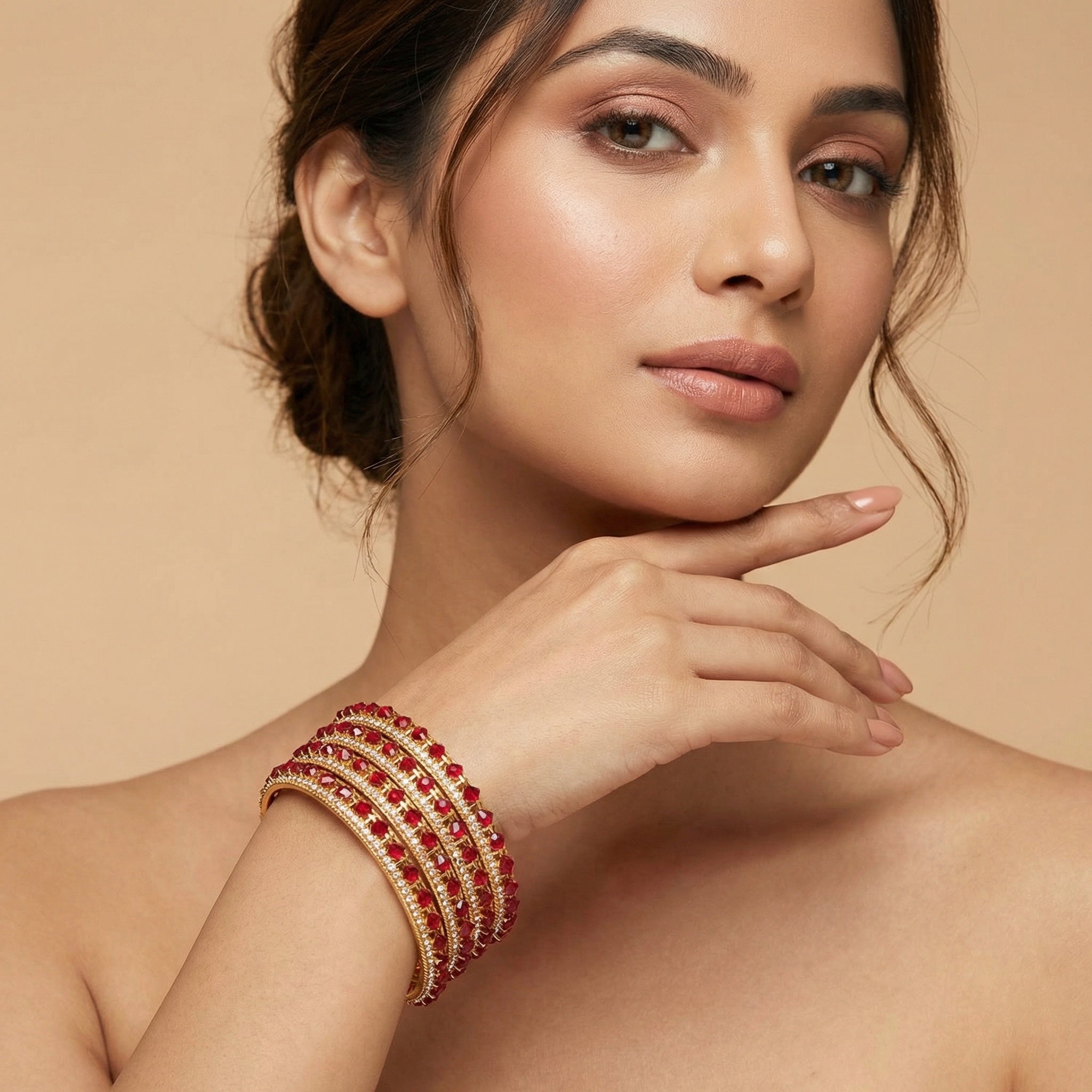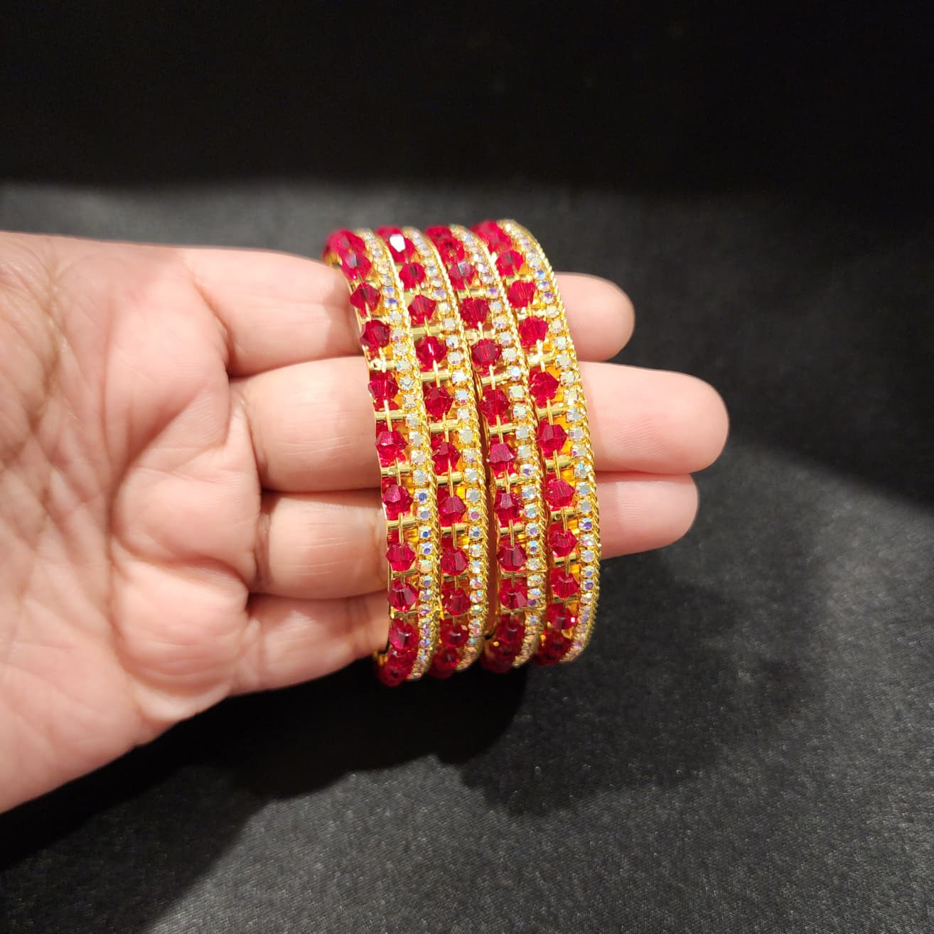 Infuse your look with timeless charm and vibrant sophistication through this exquisite set of four non-openable bangles. Bathed in a radiant gold finish, each bangle features a harmonious pattern of red and white stones—evoking the richness of traditional Indian design with a fresh, contemporary twist.