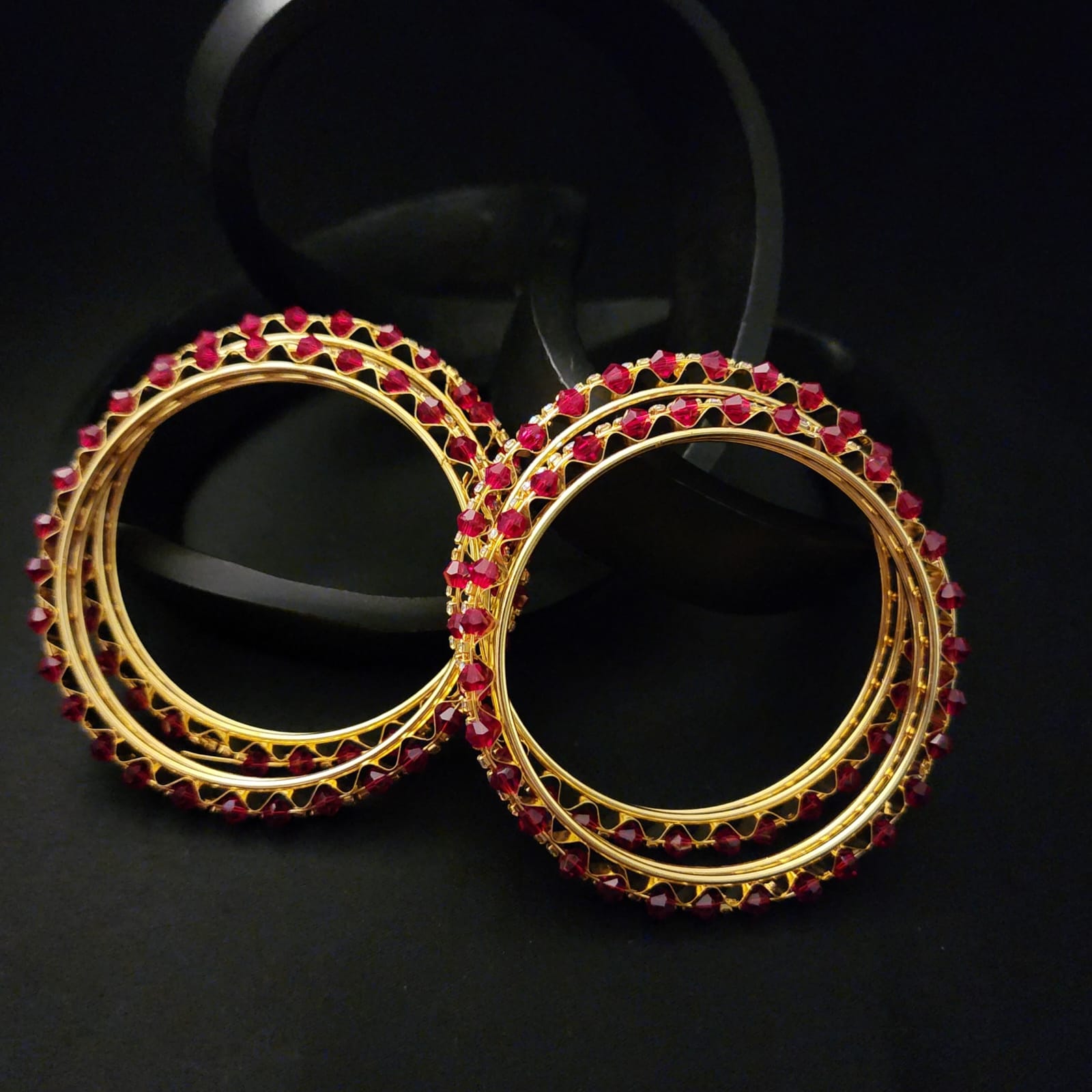 The symmetrical arrangement of stones and the intricate craftsmanship make this set a versatile treasure—perfect for layering or wearing solo. Whether paired with festive attire or styled for a wedding celebration, these bangles promise to add a regal touch to your ensemble.