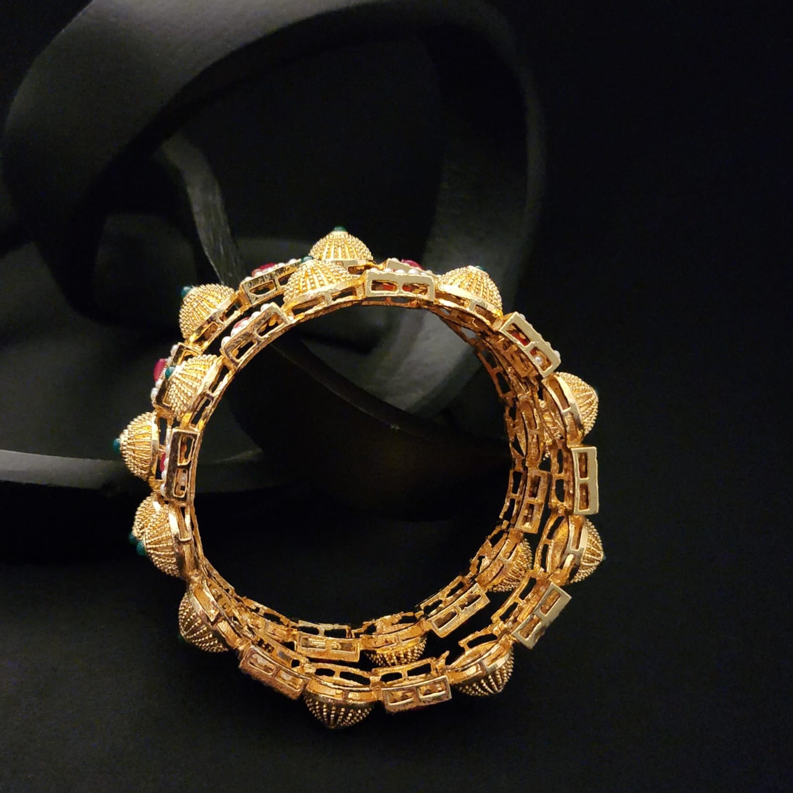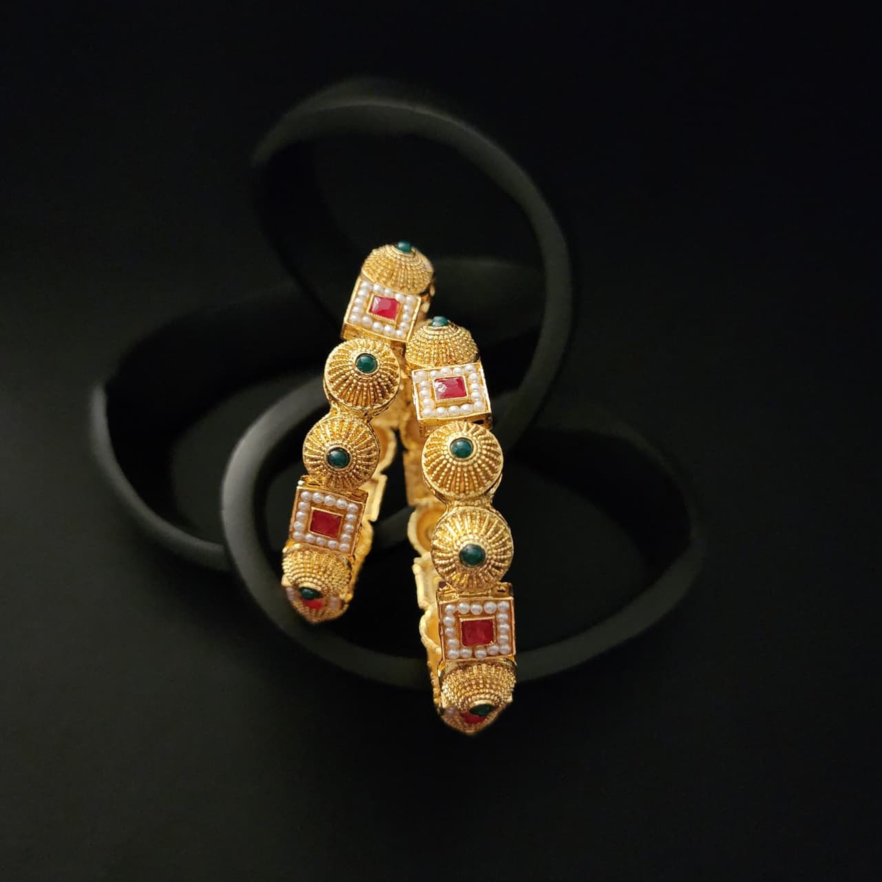 Celebrate timeless grandeur with this captivating pair of gold bangles from Eclat Indian Jewels. Designed for those who cherish intricate artistry, each bangle showcases a harmonious blend of dome-shaped green stone motifs, square red stone segments bordered with delicate white accents, and ornate circular gold detailing. The result is a visual symphony of color, texture, and tradition.