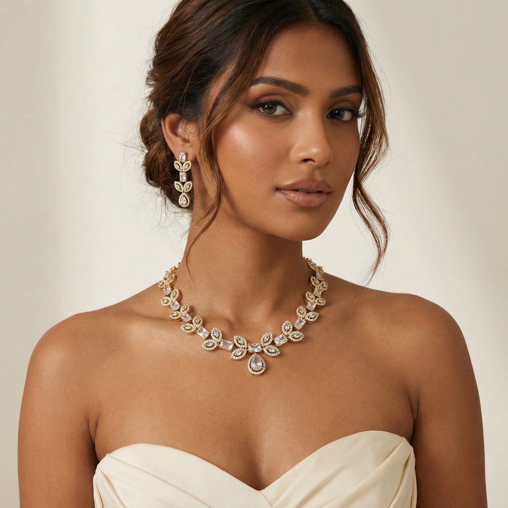 Step into the spotlight with our Luxe Cascade Necklace Set, a dazzling ensemble from Eclat Indian Jewels that redefines sophistication. Crafted in a radiant gold-toned finish, this set is encrusted with premium CZ diamond simulants, offering the brilliance of real diamonds with a lightweight, wearable charm.
