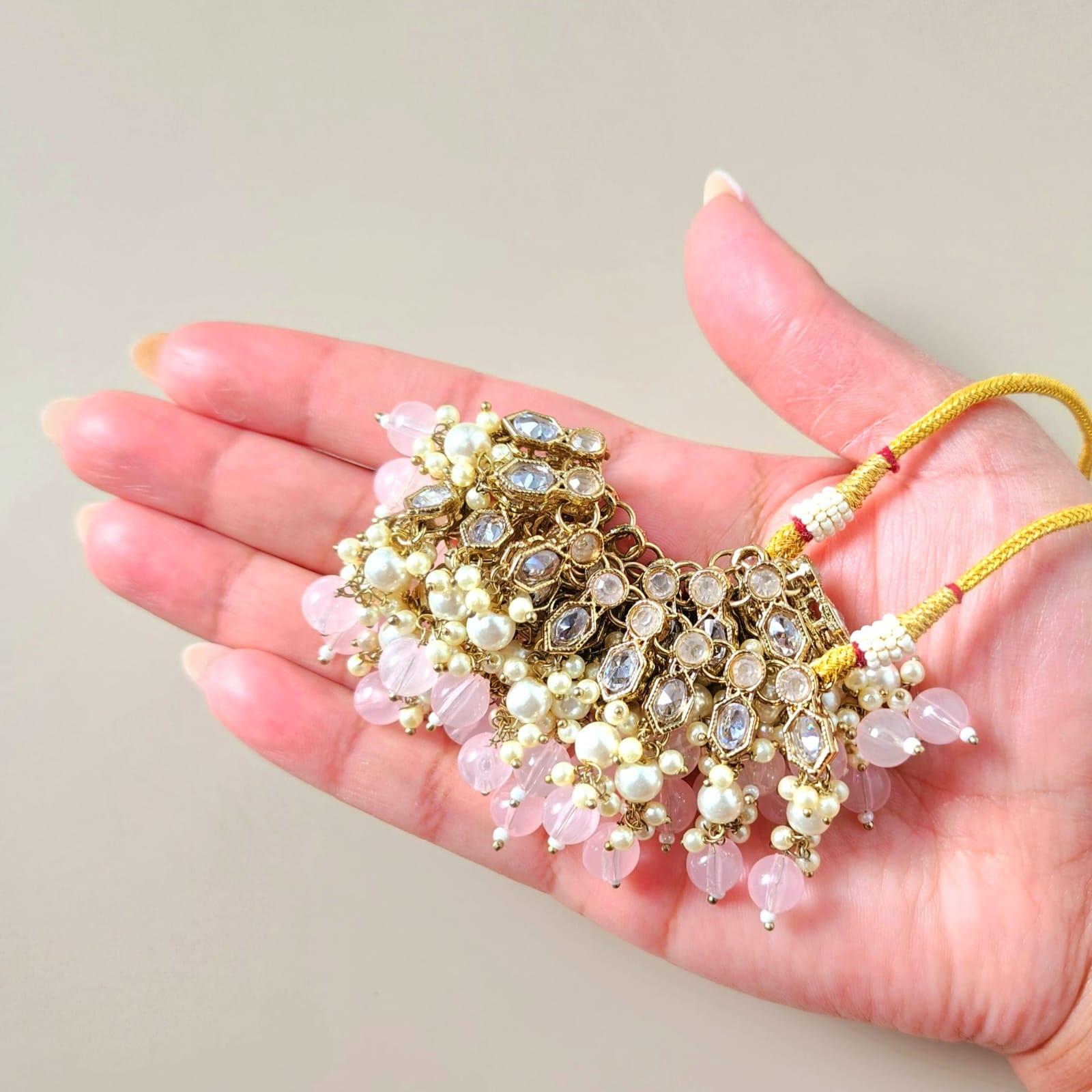 The matching earrings mirror the choker’s ornate detailing, with floral motifs and cascading pink beads that frame the face beautifully. Completing the set is a coordinating maang tikka, designed to sit gracefully at the hairline and tie the entire look together in regal harmony.