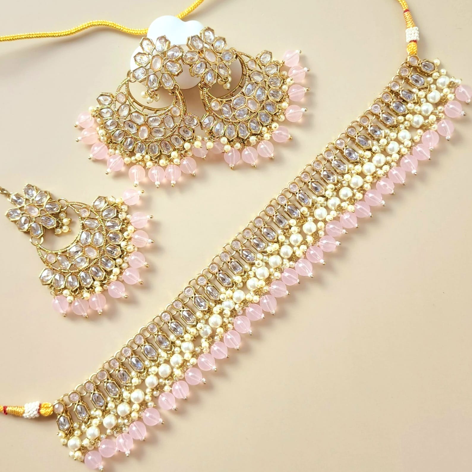 Drape yourself in timeless elegance with our Gulzar Polki Choker Set—a radiant ensemble crafted for the bride who embraces heritage with grace. Set in a rich gold finish, this choker features alternating rows of lustrous pearls, sparkling Polki stones, and soft pink beads that add a delicate pop of color. The intricate design evokes the opulence of royal courts, making it a perfect choice for weddings, receptions, or ceremonial occasions.