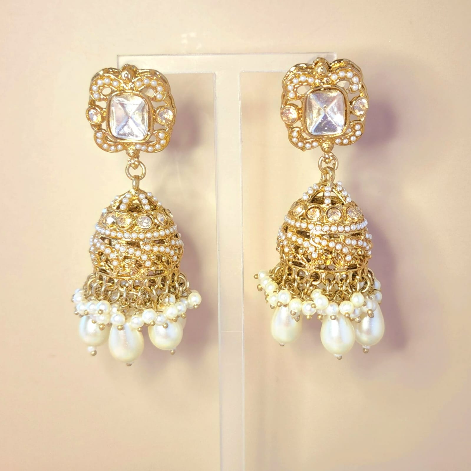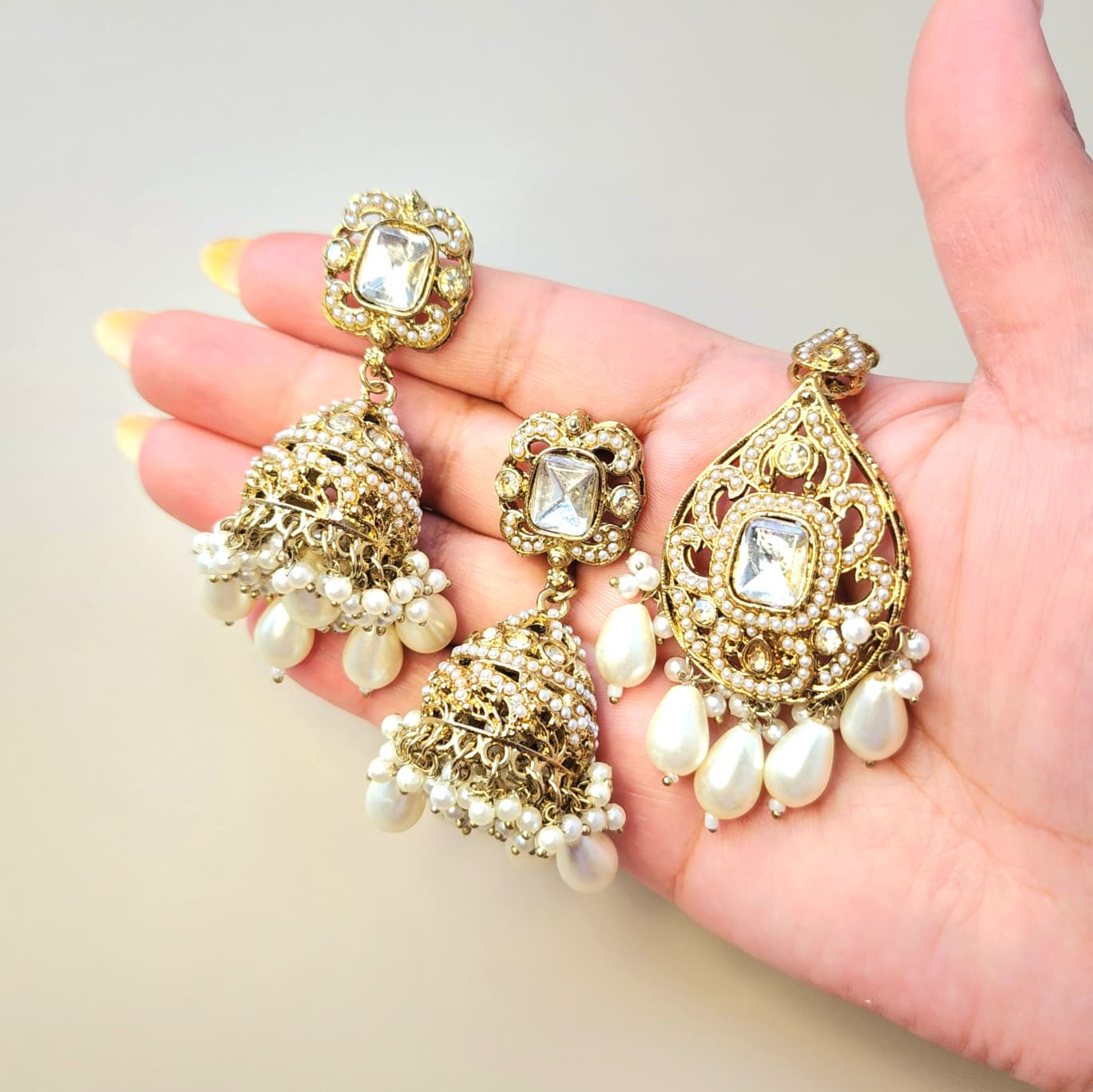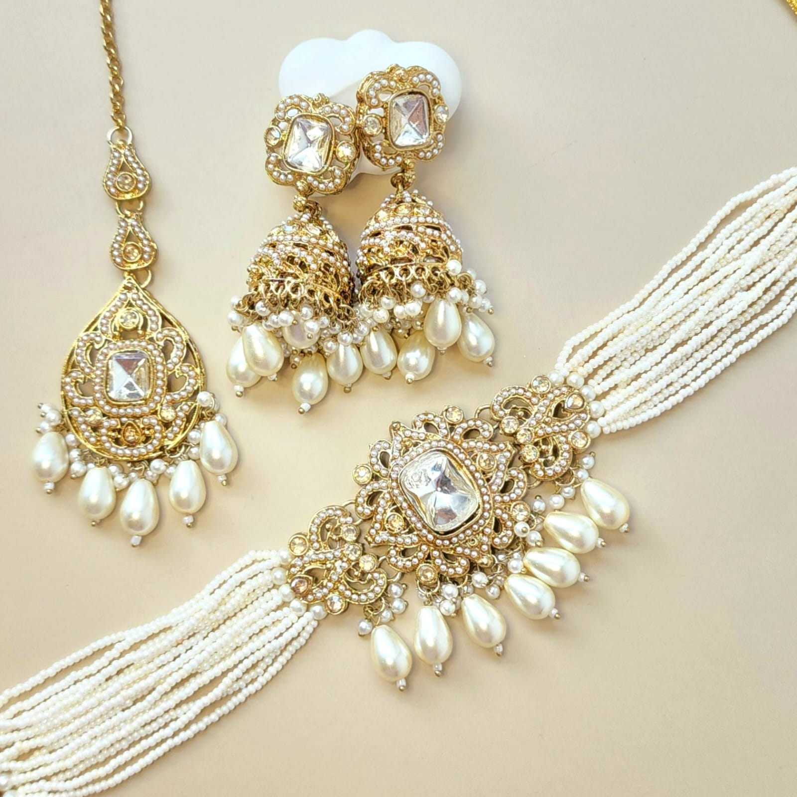The choker features multiple strands of lustrous white beads, anchored by a central gold-toned pendant encrusted with high-grade white polki-style stones and delicate pearl drops. The matching jhumkas echo the ornate filigree work, crowned with shimmering stones and finished with cascading pearls that sway with every step. Completing the set is a teardrop-shaped maang tikka, designed to sit elegantly on the forehead, adding ceremonial finesse to your bridal or festive look.