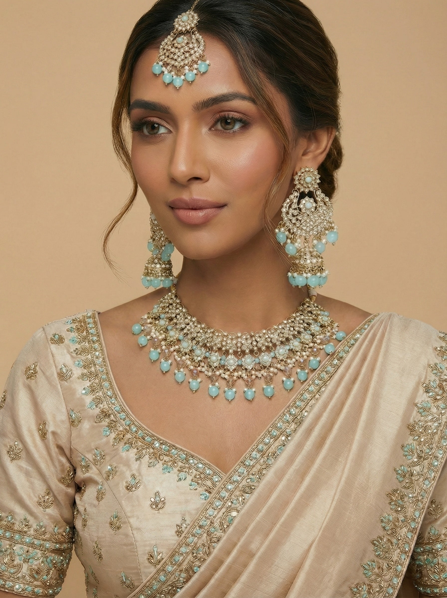 • Elegant Maang Tikka: Completing the set, the maang tikka rests gracefully on your forehead, enhancing your ethnic allure.
