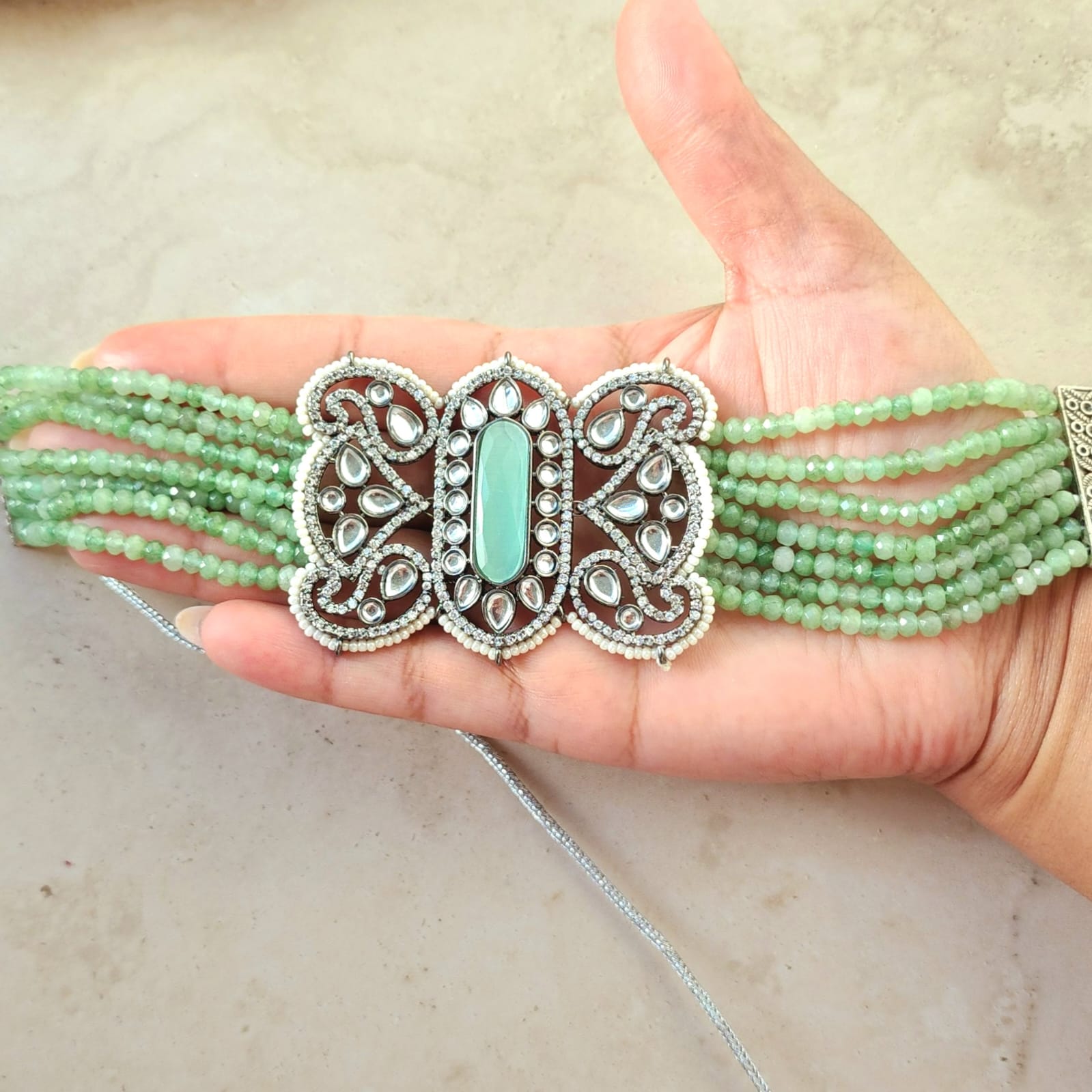 Bold. Regal. Unforgettable. Our Noor Noir Choker Set is a striking fusion of Mughal grandeur and modern sophistication. Crafted in a rare black rhodium finish, this statement piece reimagines traditional Kundan artistry with a contemporary twist. The choker features a lush arrangement of green bead strands, anchored by an ornate central motif adorned with radiant white stones and a deep emerald centerpiece—evoking timeless elegance with a moody edge.