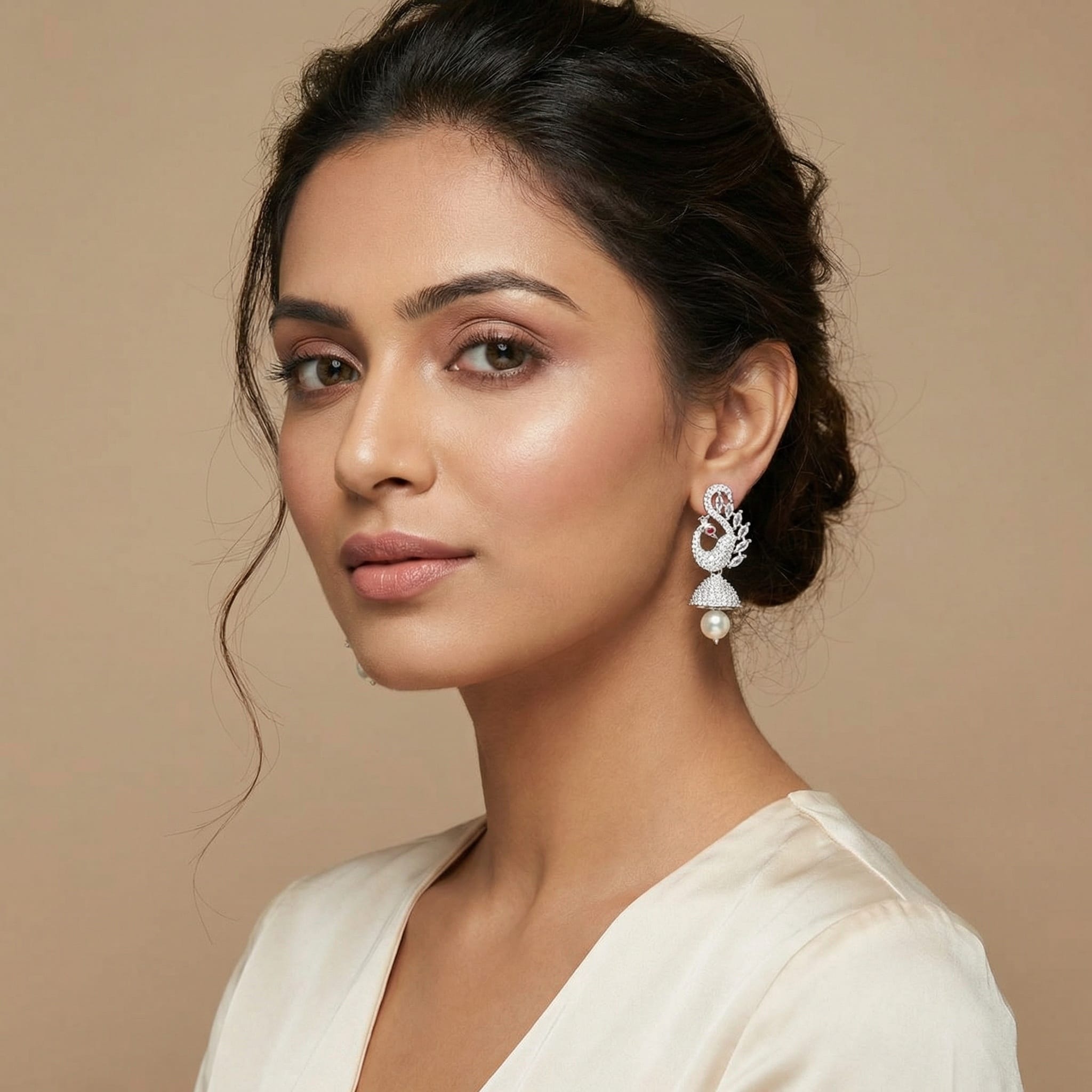 Elevate your style with our stunning white rhodium plated Jhumki, a true masterpiece measuring 4.8 cm. Crafted with precision and adorned with dazzling American diamonds, this jhumki is a testament to elegance and sophistication.