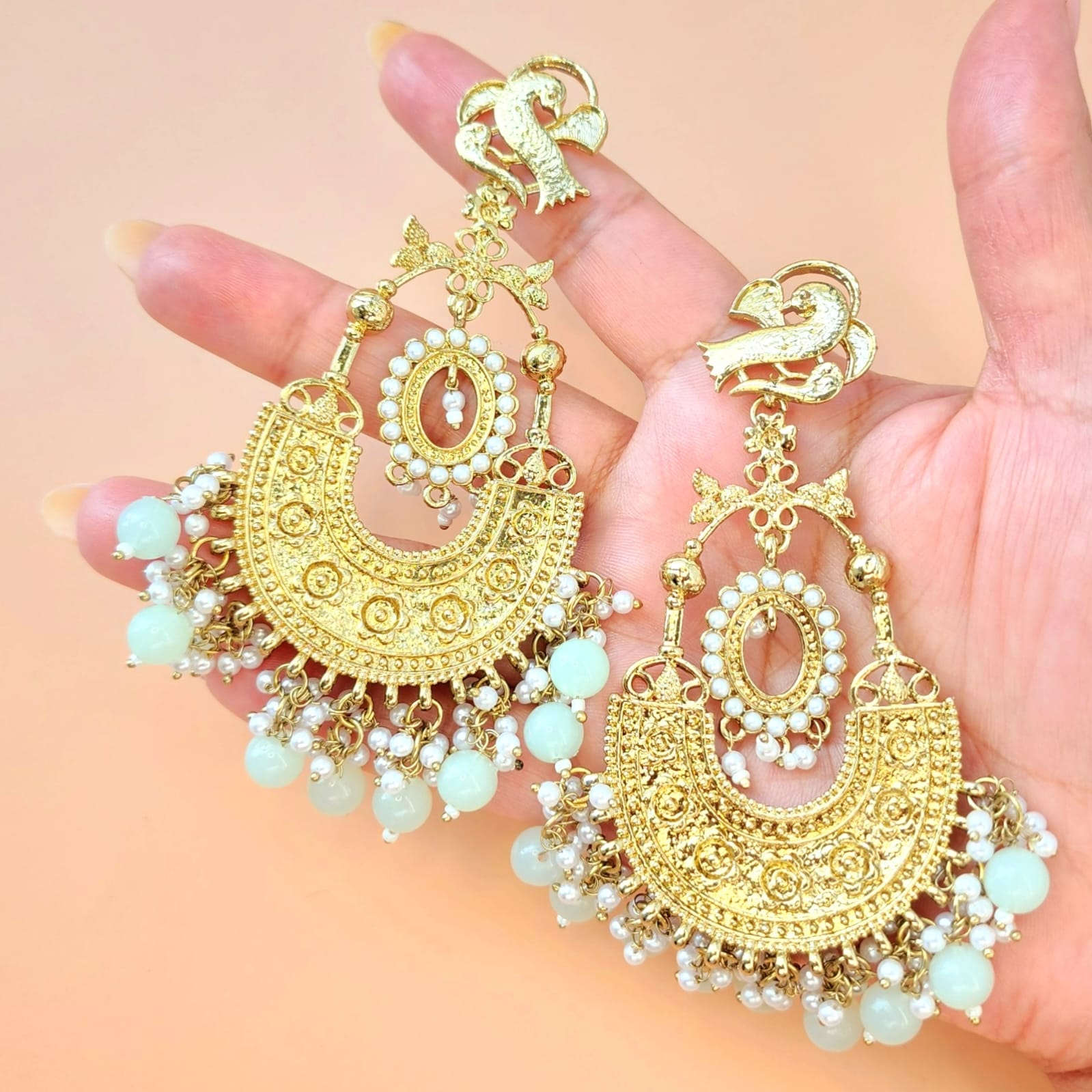 The lower half features a semi-circular gold structure with engraved textures and vibrant bead clusters in alternating light green and white—adding movement, contrast, and ceremonial charm. These earrings are designed to make a statement, whether worn for weddings, festive rituals, or heirloom gifting.
