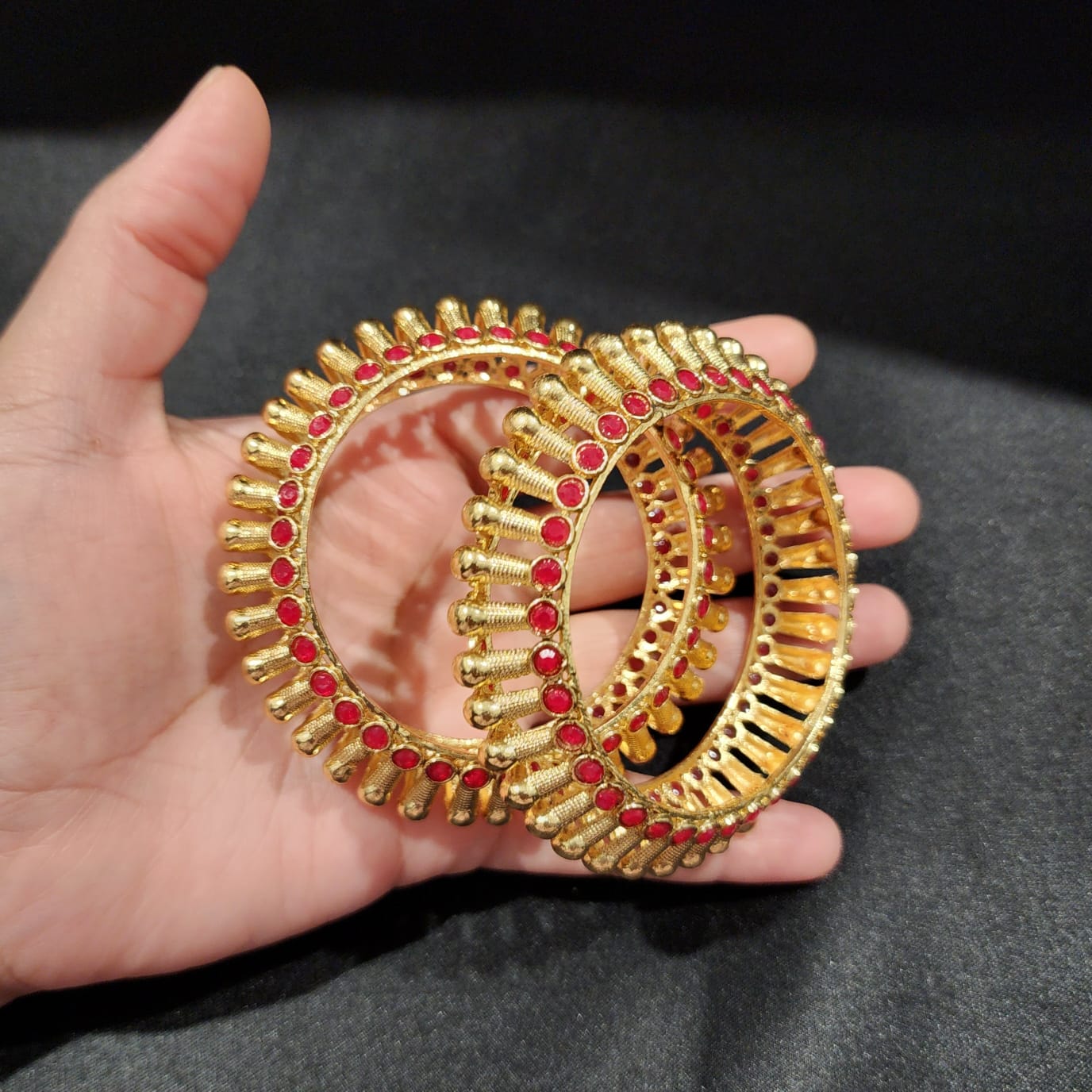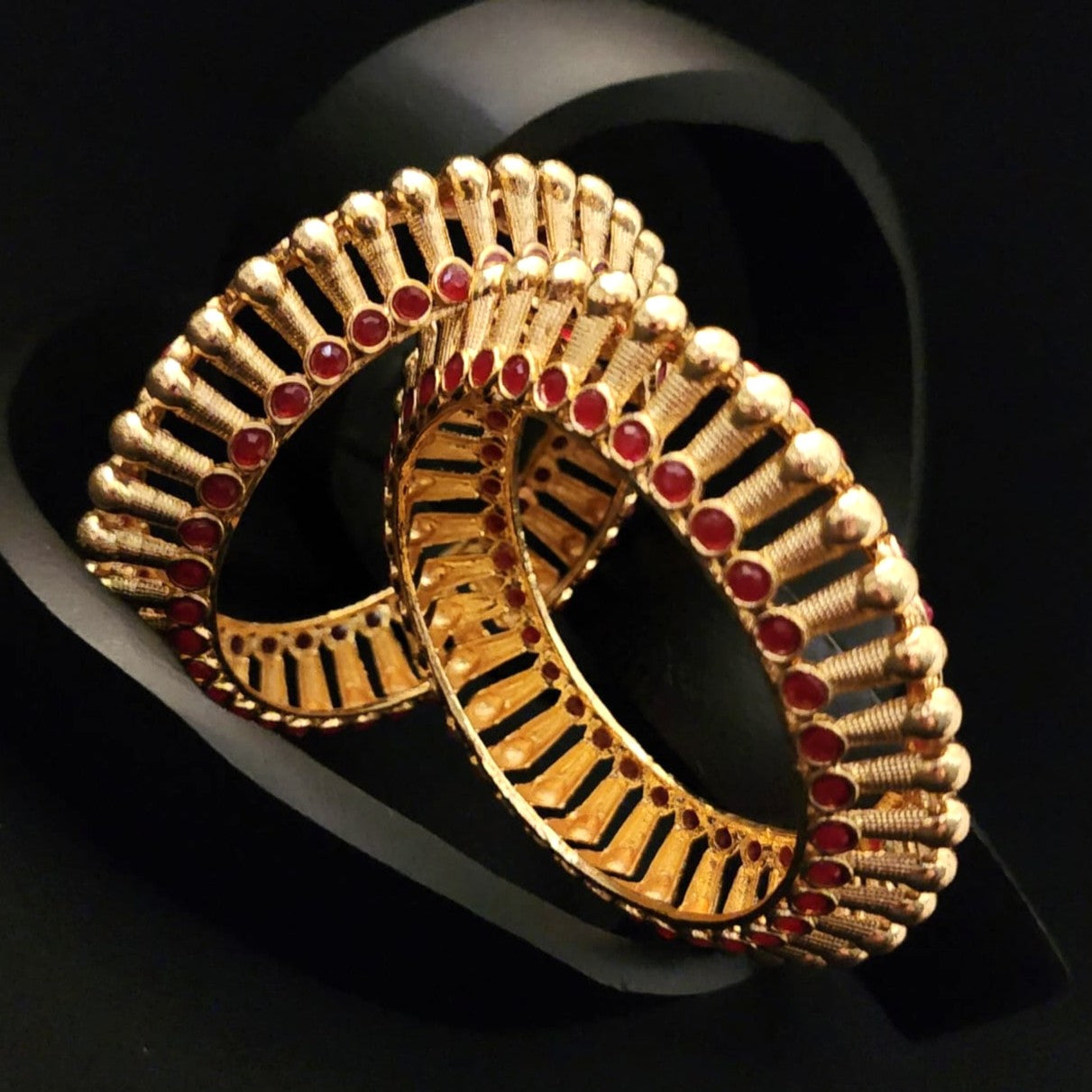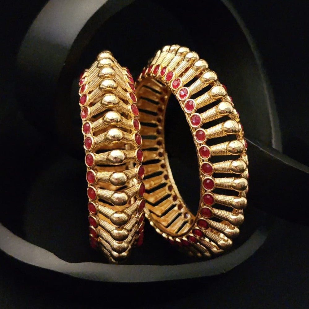 Command attention with this opulent pair of non-openable kada bangles, drenched in a rich gold finish and adorned with fiery red stones that evoke timeless grandeur. Each bangle features a striking interplay of raised and recessed segments, where textured gold meets symmetrical ruby-toned embellishments—creating depth, drama, and undeniable elegance.