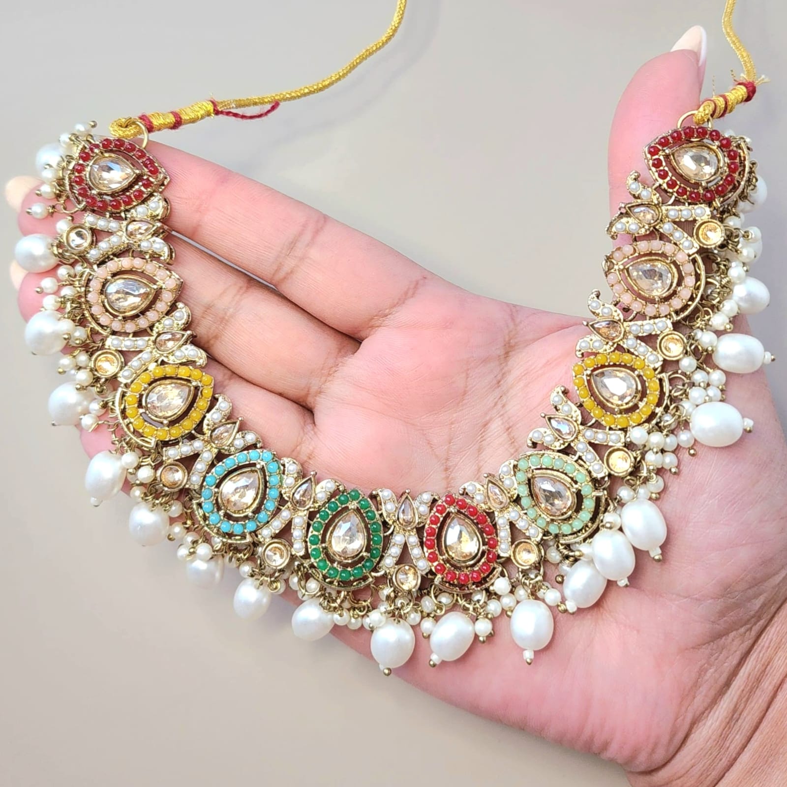 A statement polki necklace adorned with dazzling polki stones, arranged in ornate segments that echo royal artistry. Each pendant-like element is bordered with multicolored beads—ruby red, emerald green, sapphire blue, peach and sunshine yellow—creating a kaleidoscope of elegance.