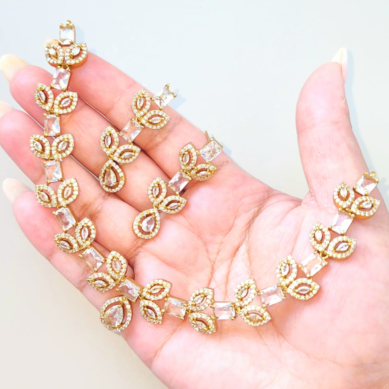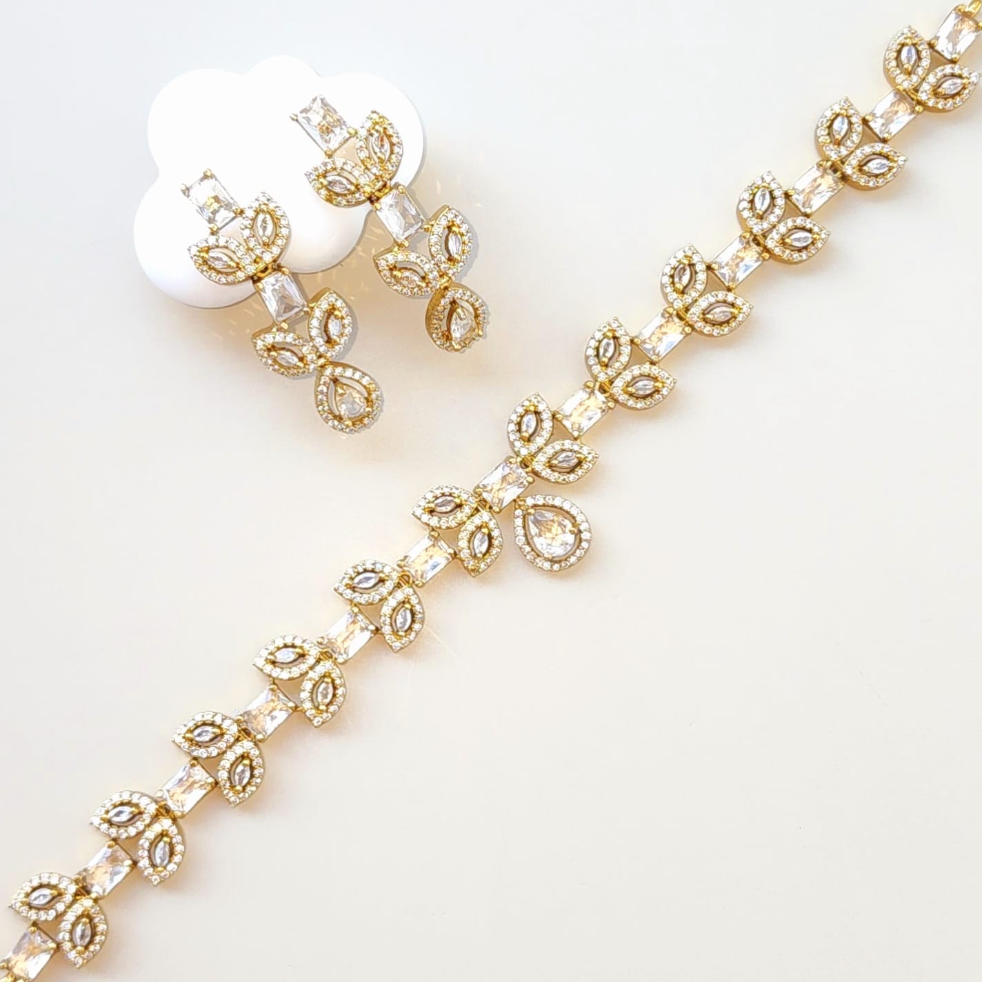 The necklace features a graceful flow of marquise and teardrop-shaped motifs, each shimmering with clear stones that catch the light from every angle. Its elegant symmetry and refined sparkle make it perfect for bridal wear, cocktail evenings, or formal celebrations.