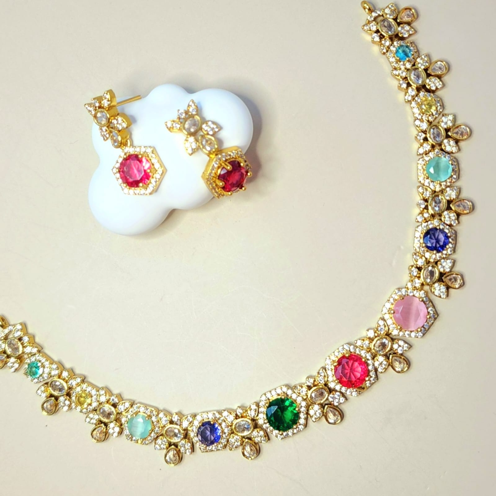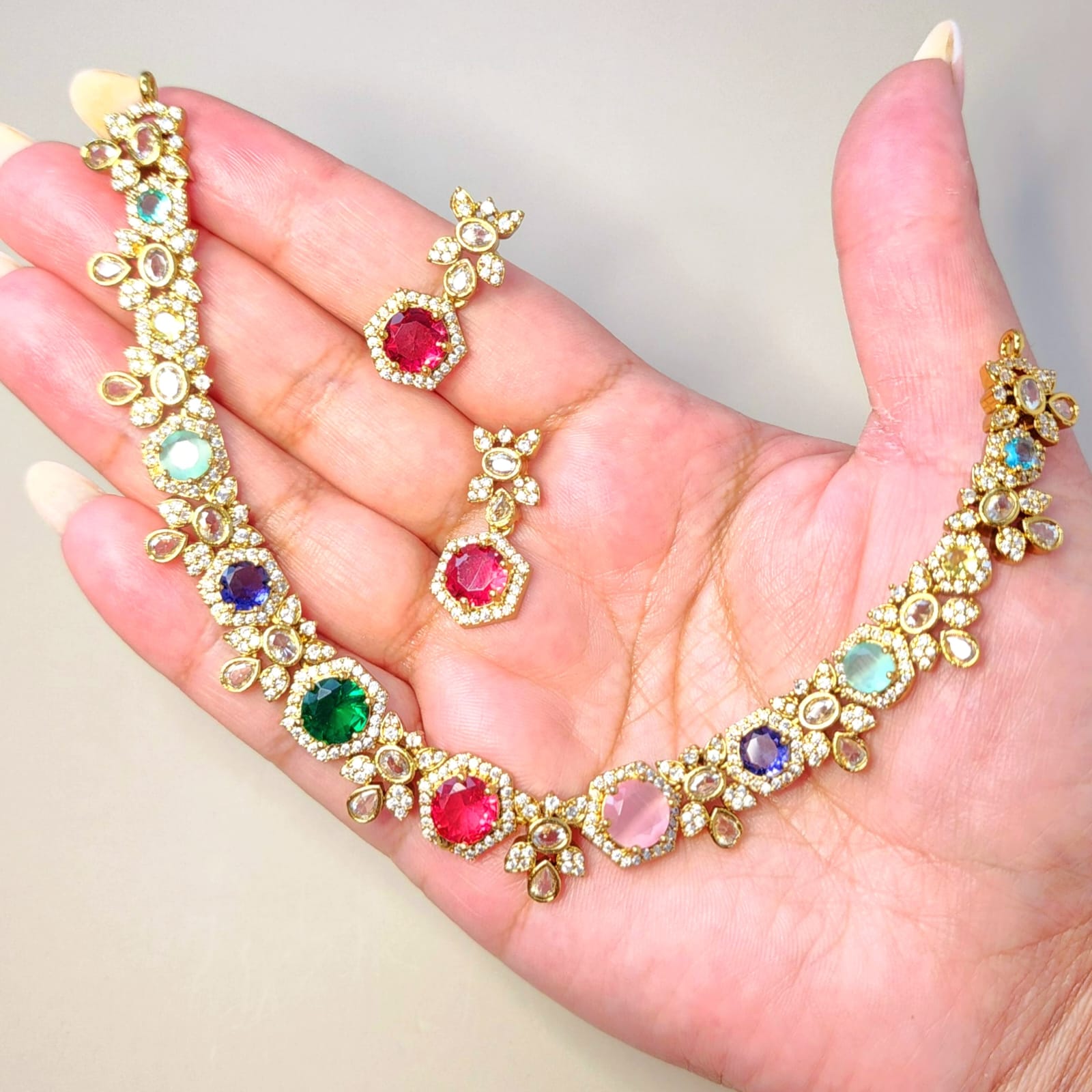 Celebrate colour, sparkle, and craftsmanship with our Prismatic Charm Necklace Set, a radiant ensemble from Eclat Indian Jewels that brings together tradition and contemporary flair. This gold-toned beauty is studded with premium CZ diamond simulants and a kaleidoscope of multicolour stones—pink, green, turquoise, red, and sapphire blue—each nestled in delicate floral and circular motifs.