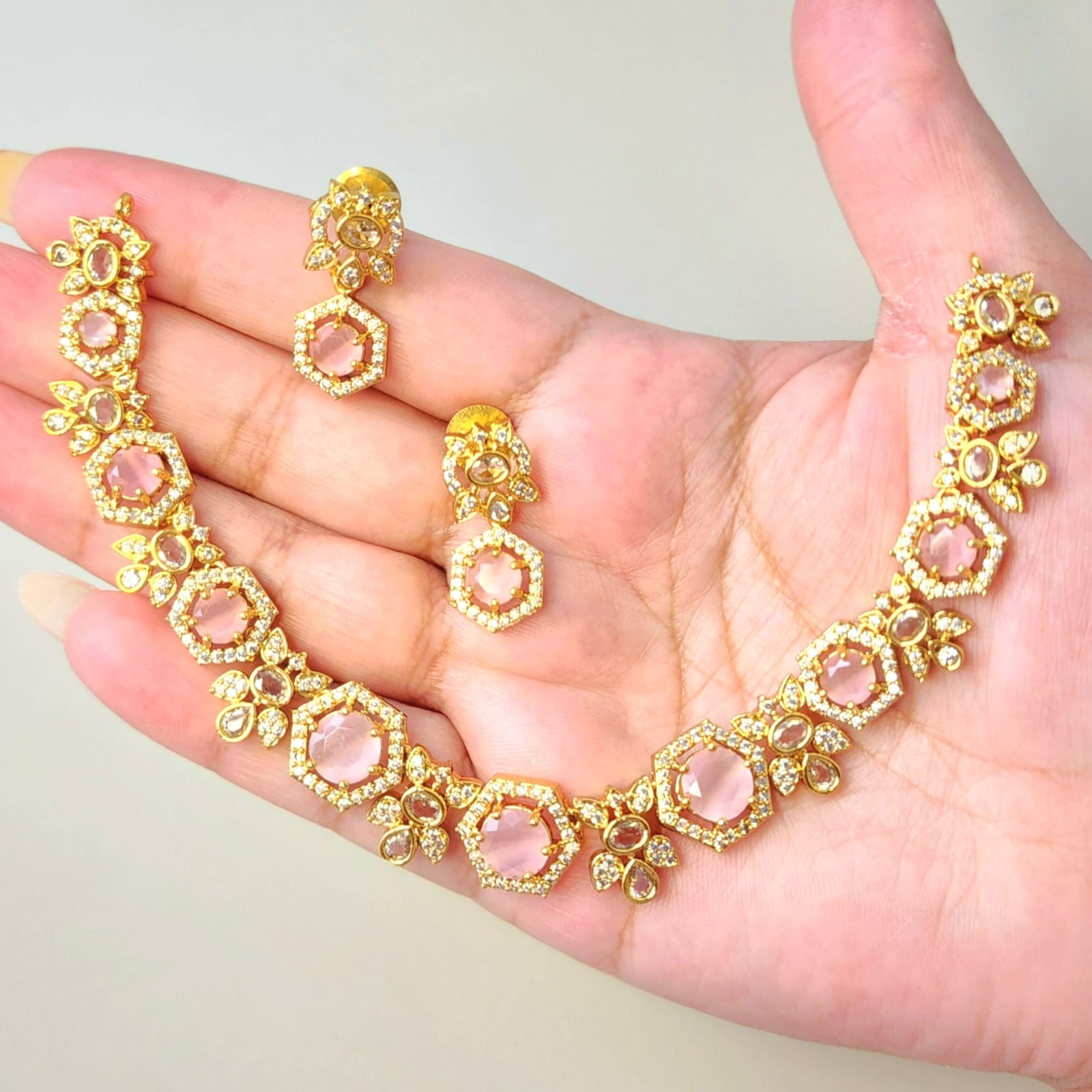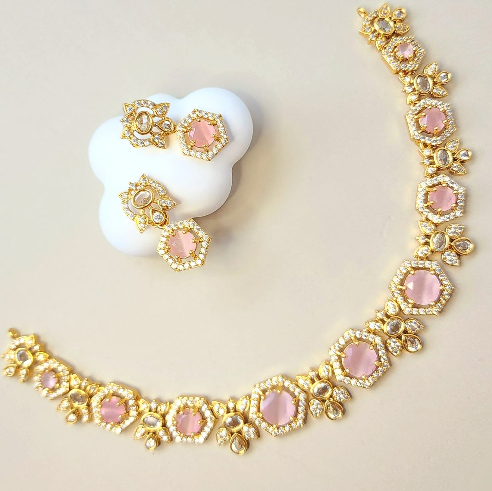 Celebrate colour, sparkle, and craftsmanship with our Prismatic Charm Necklace Set, a radiant ensemble from Eclat Indian Jewels that brings together tradition and contemporary flair. This gold-toned beauty is studded with premium CZ diamond simulants and pink stones nestled in delicate floral and circular motifs.