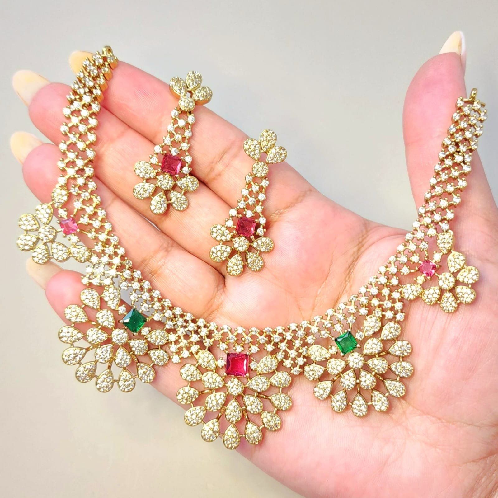 Elevate your ensemble with the Celestial Bloom Necklace Set, a radiant celebration of floral artistry and modern sophistication. This exquisite piece is encrusted with high-grade CZ diamond simulants that shimmer with lifelike brilliance, capturing the allure of real diamonds without the weight or worry.