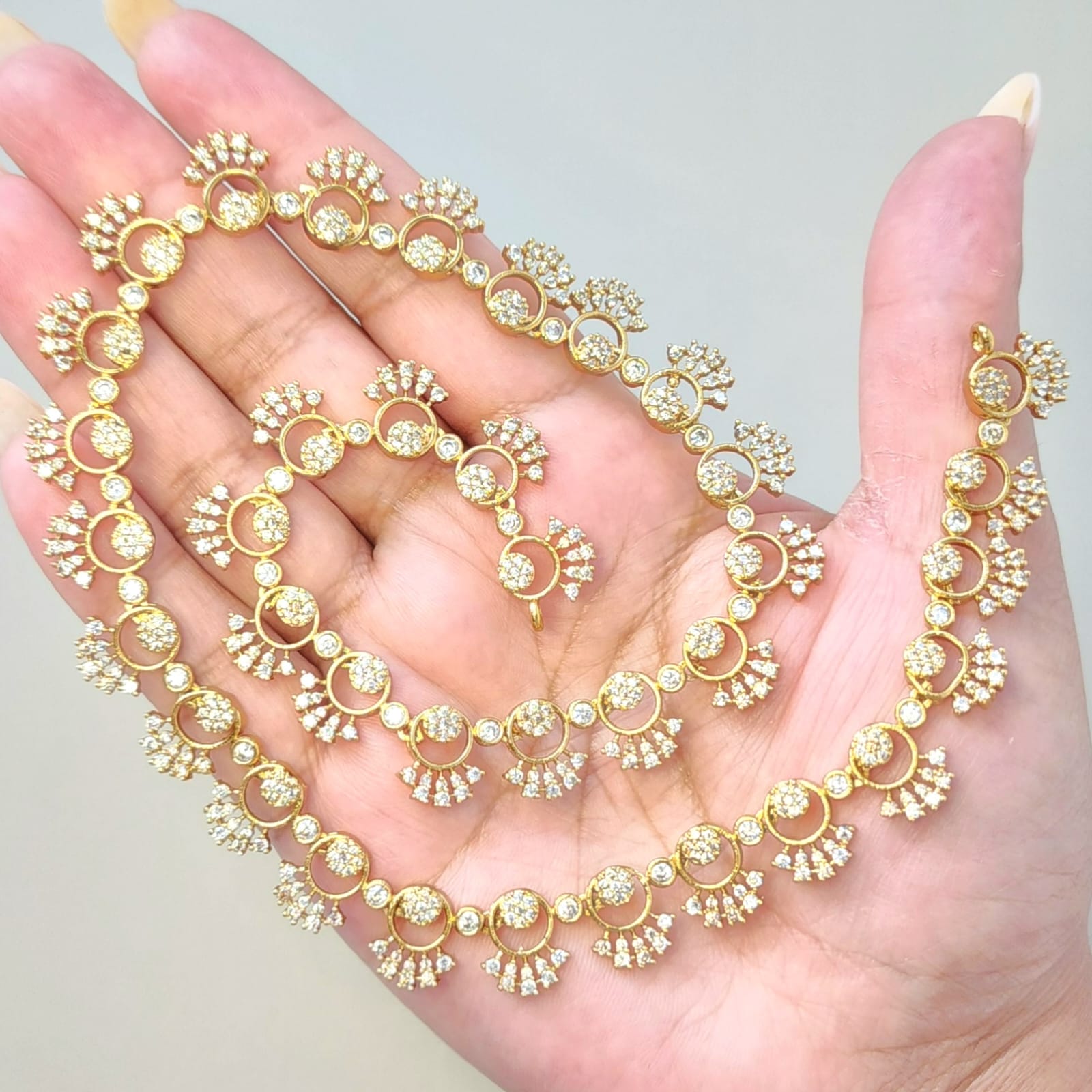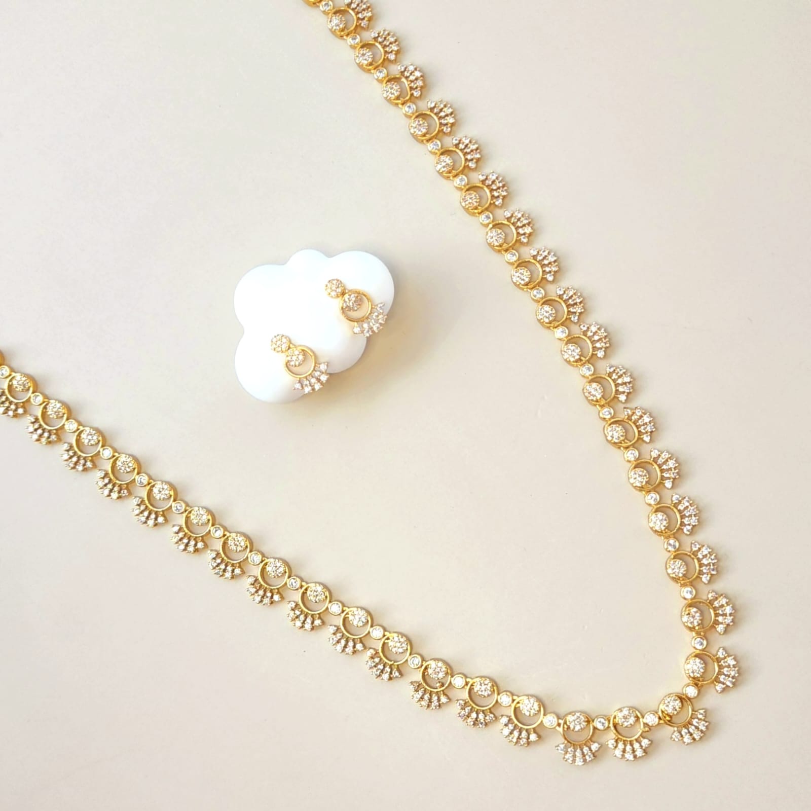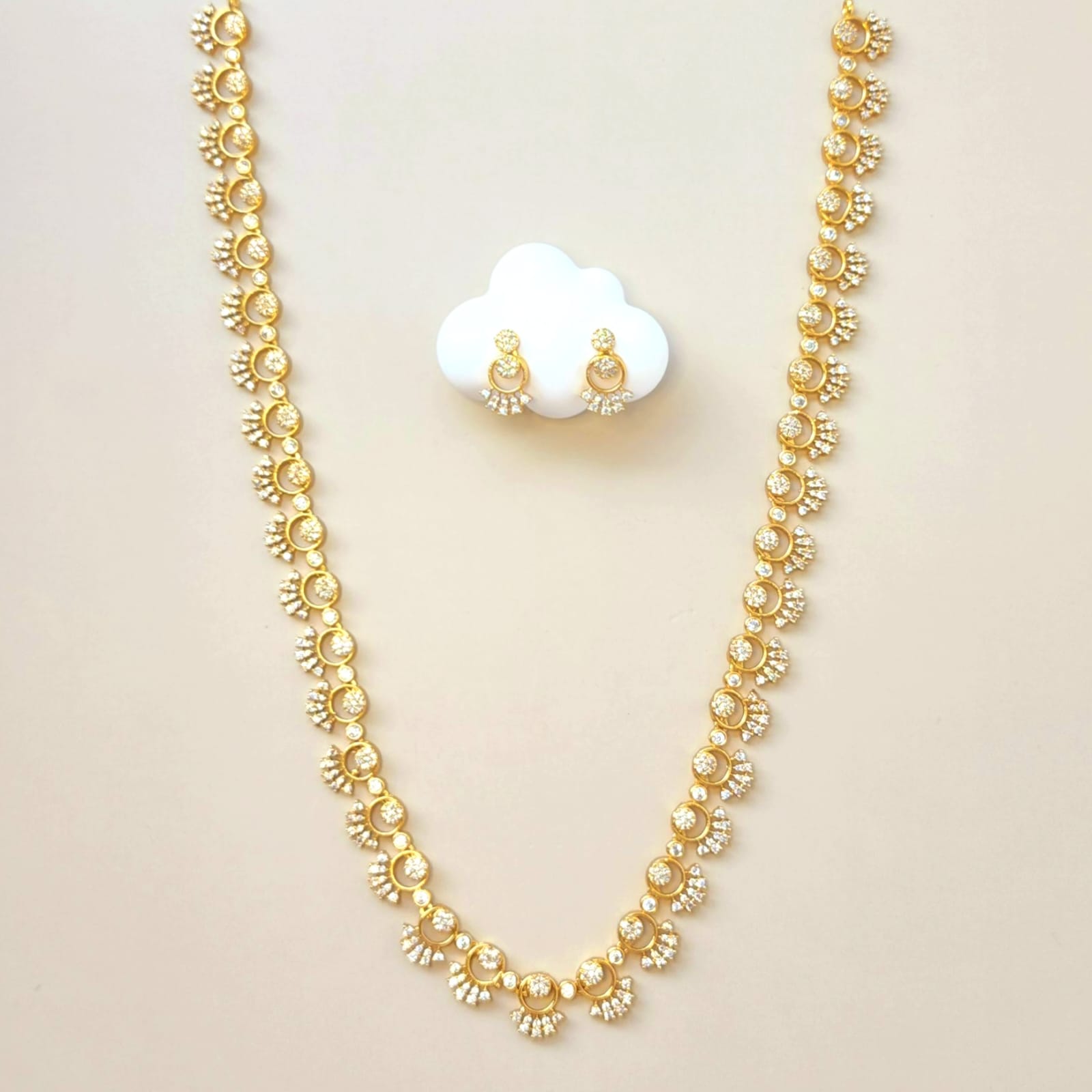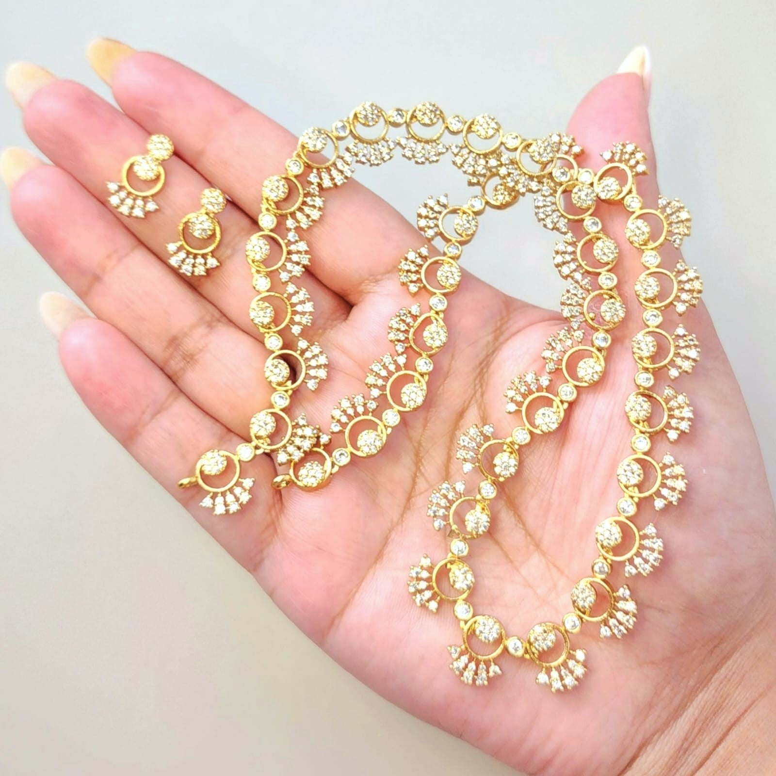 Step into timeless elegance with our Sunlit Grace Necklace Set, a radiant long-style ensemble from Eclat Indian Jewels that celebrates tradition with a modern sparkle. Crafted with precision, this gold-toned set is adorned with premium CZ diamond simulants, each stone reflecting light like a dream.