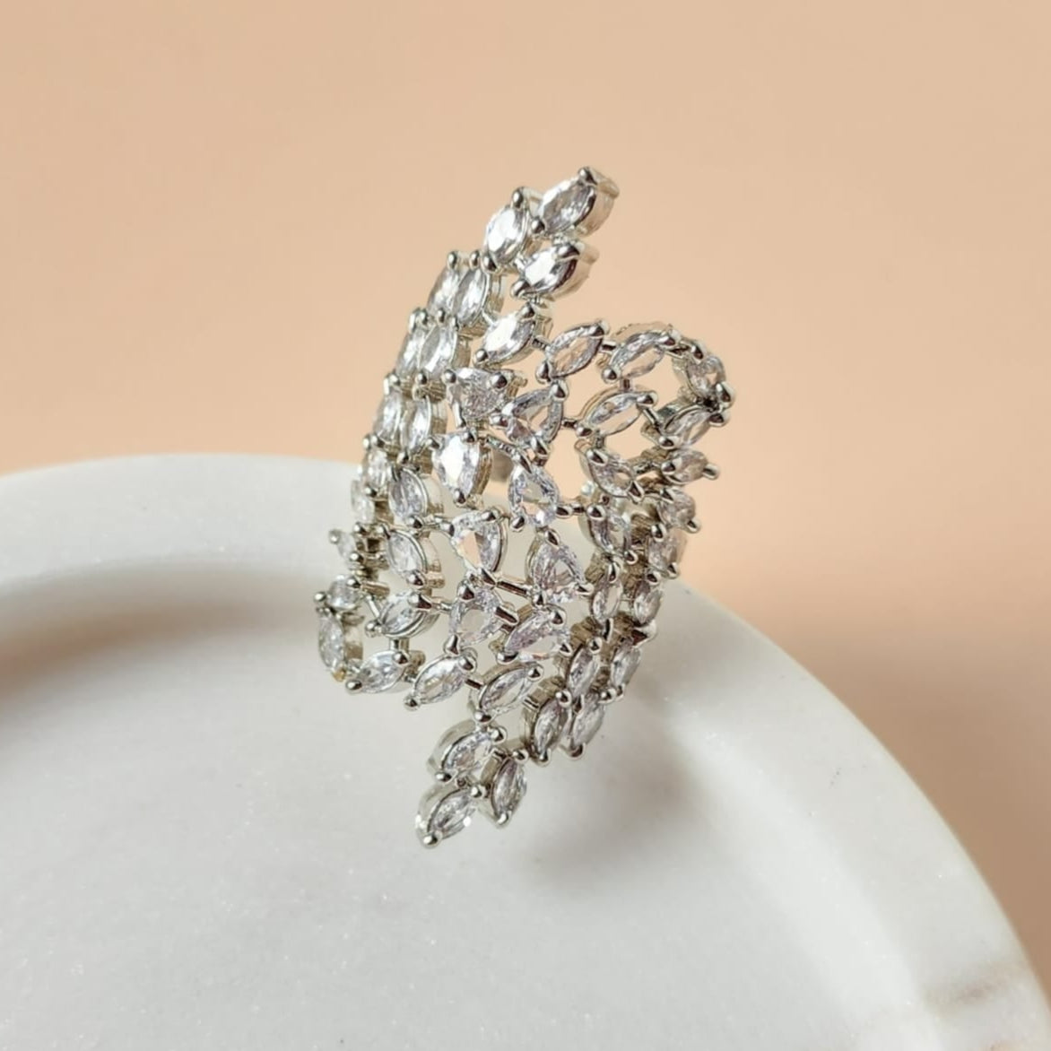 Delicate yet dazzling, this silver ring from Eclat Indian Jewels is a tribute to nature’s quiet elegance. Designed with a graceful leaf-like arrangement of marquise-cut clear stones, each gem catches the light with ethereal brilliance. The intricate setting and polished silver band create a look that’s both refined and romantic—perfect for those who appreciate understated luxury.