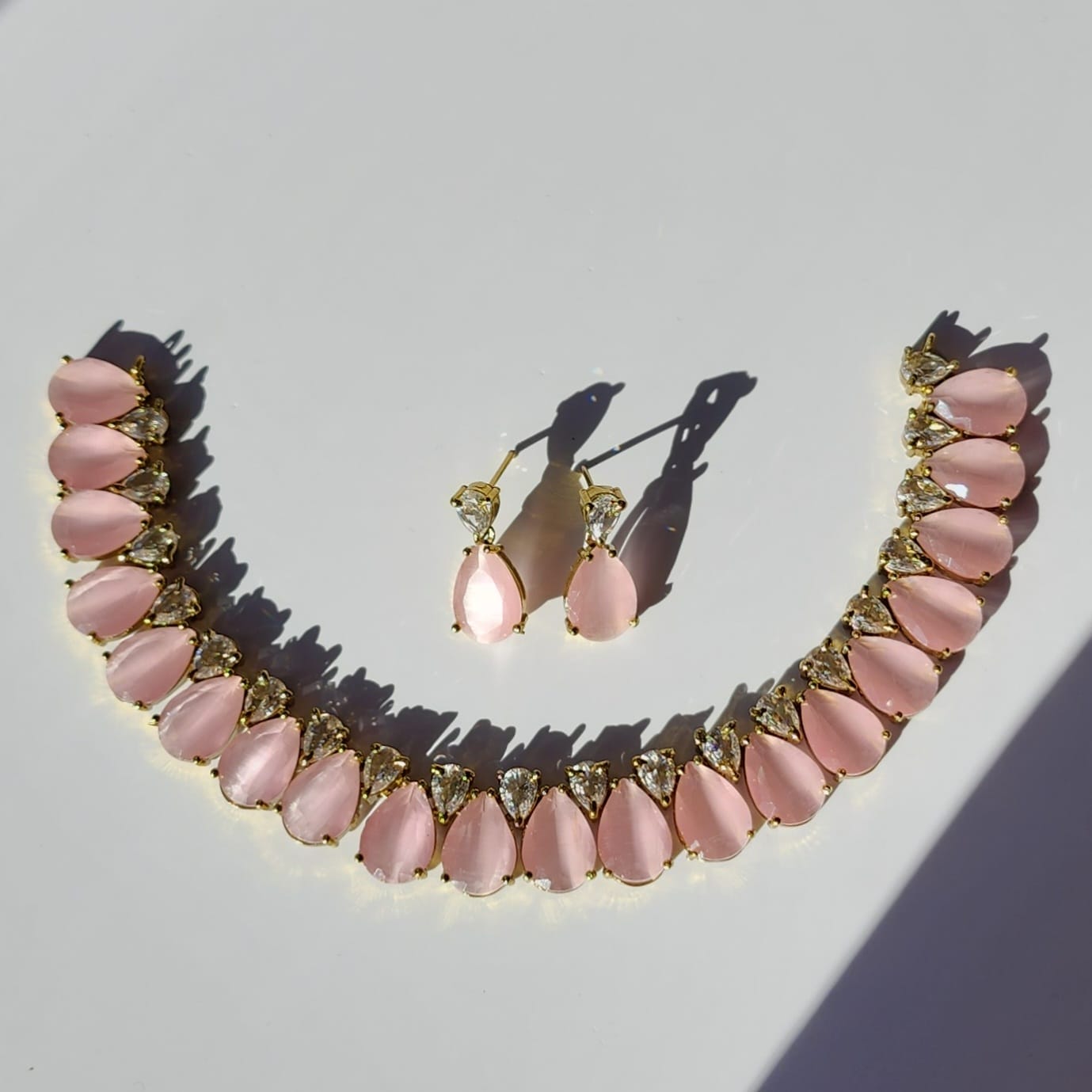 Designed to captivate, the necklace features a graceful arrangement of light pink teardrop stones, beautifully complemented by sparkling cubic zirconia (CZ) diamonds. The antique Victorian setting enhances the brilliance of each stone, giving the entire set a rich, heirloom-inspired look.
