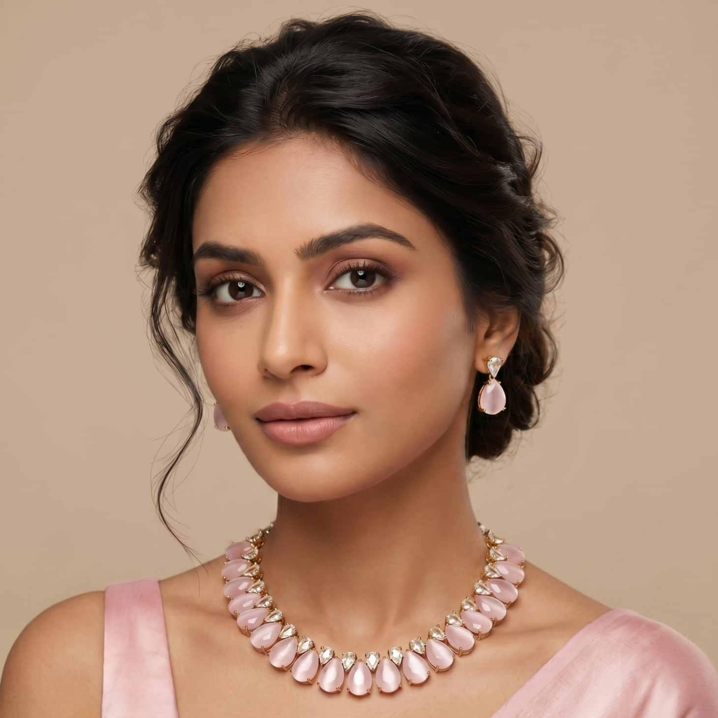The regal light pink tones add depth and sophistication, making this standout piece in pink jewellery perfect for weddings, festive occasions, and evening glamour. Each stone is meticulously set to reflect light effortlessly, ensuring a radiant sparkle with every movement.