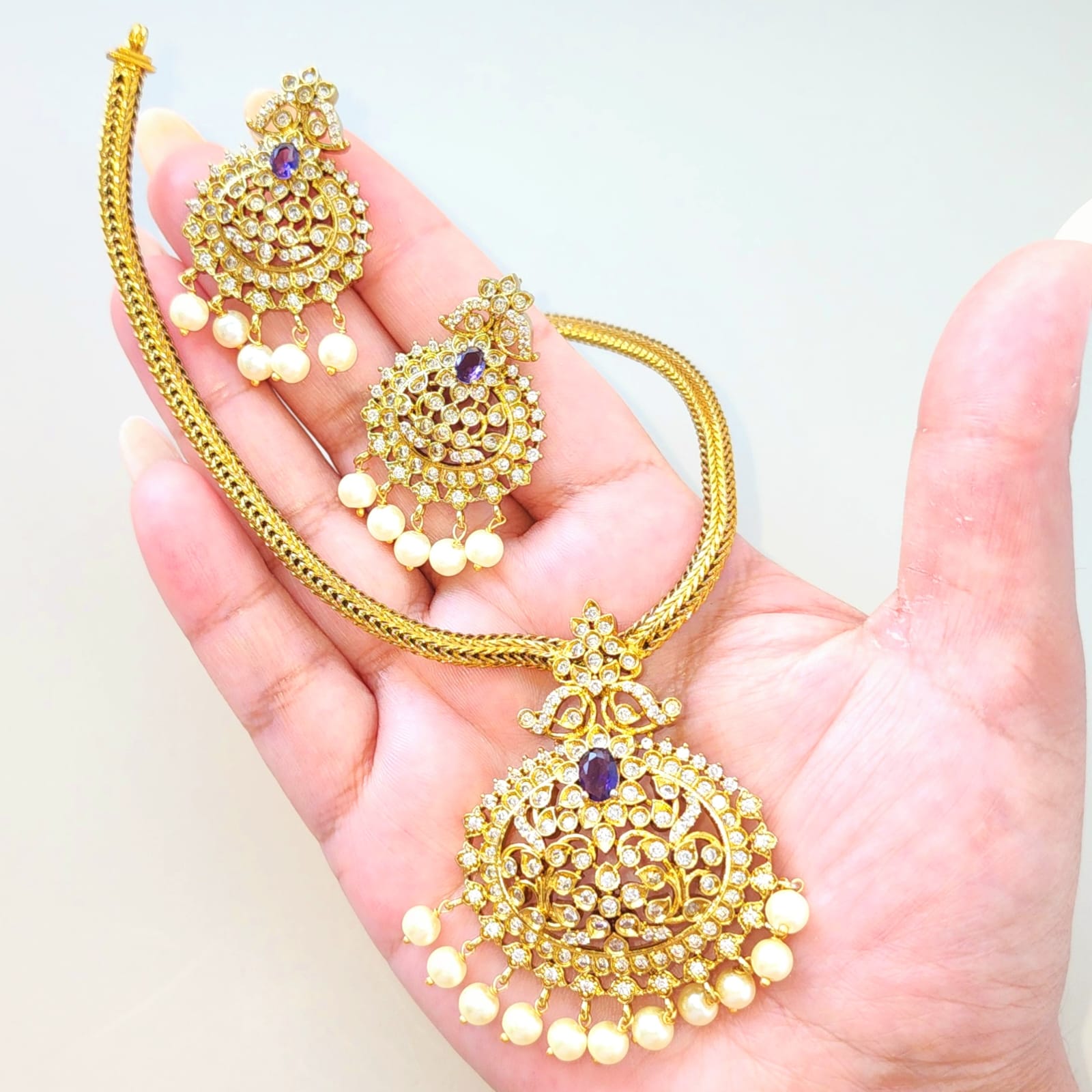 Embrace timeless tradition with a touch of sparkle in our Amethyst Bloom Pendant Set, a regal creation from Eclat Indian Jewels. This gold-toned ensemble is intricately studded with premium CZ diamond simulants, offering the brilliance of real diamonds paired with the richness of classic Indian design.