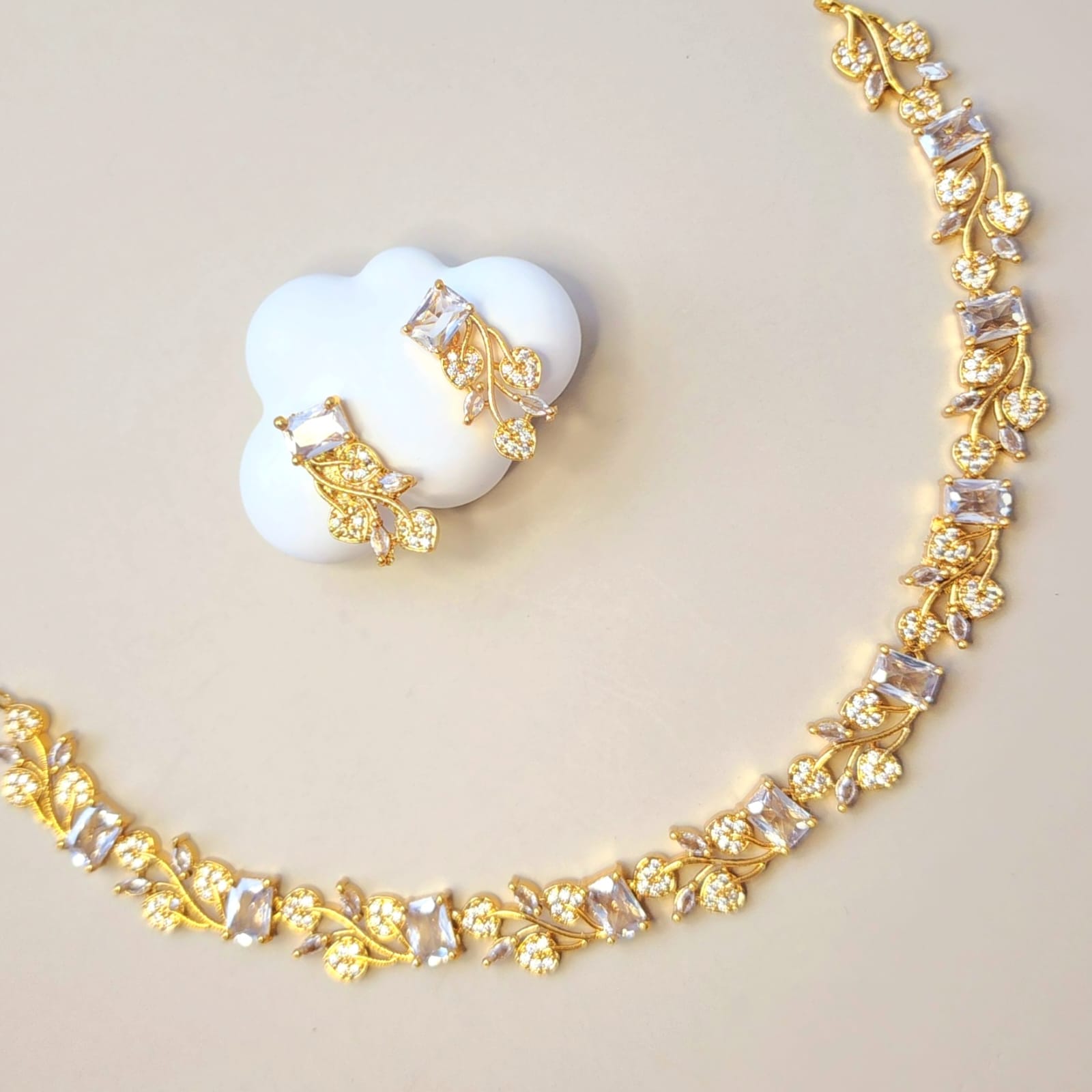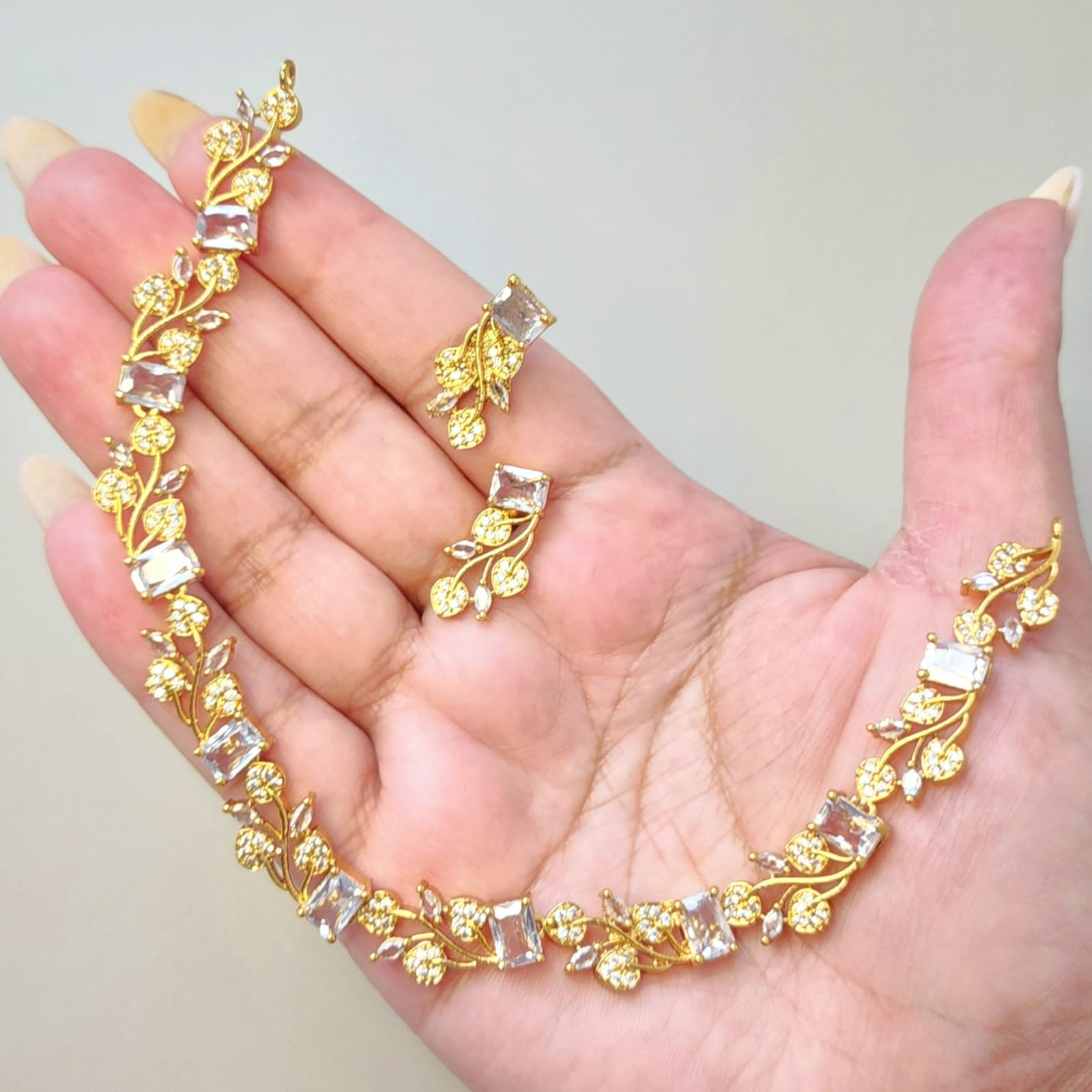 The necklace features rectangular clear white stones, each framed by delicate gold detailing that catches the light with every movement. The matching earrings, measuring 2.3 cm, mirror the necklace’s charm with petite leaf accents and clear white stones—perfect for adding a pop of color to your festive or formal ensemble.