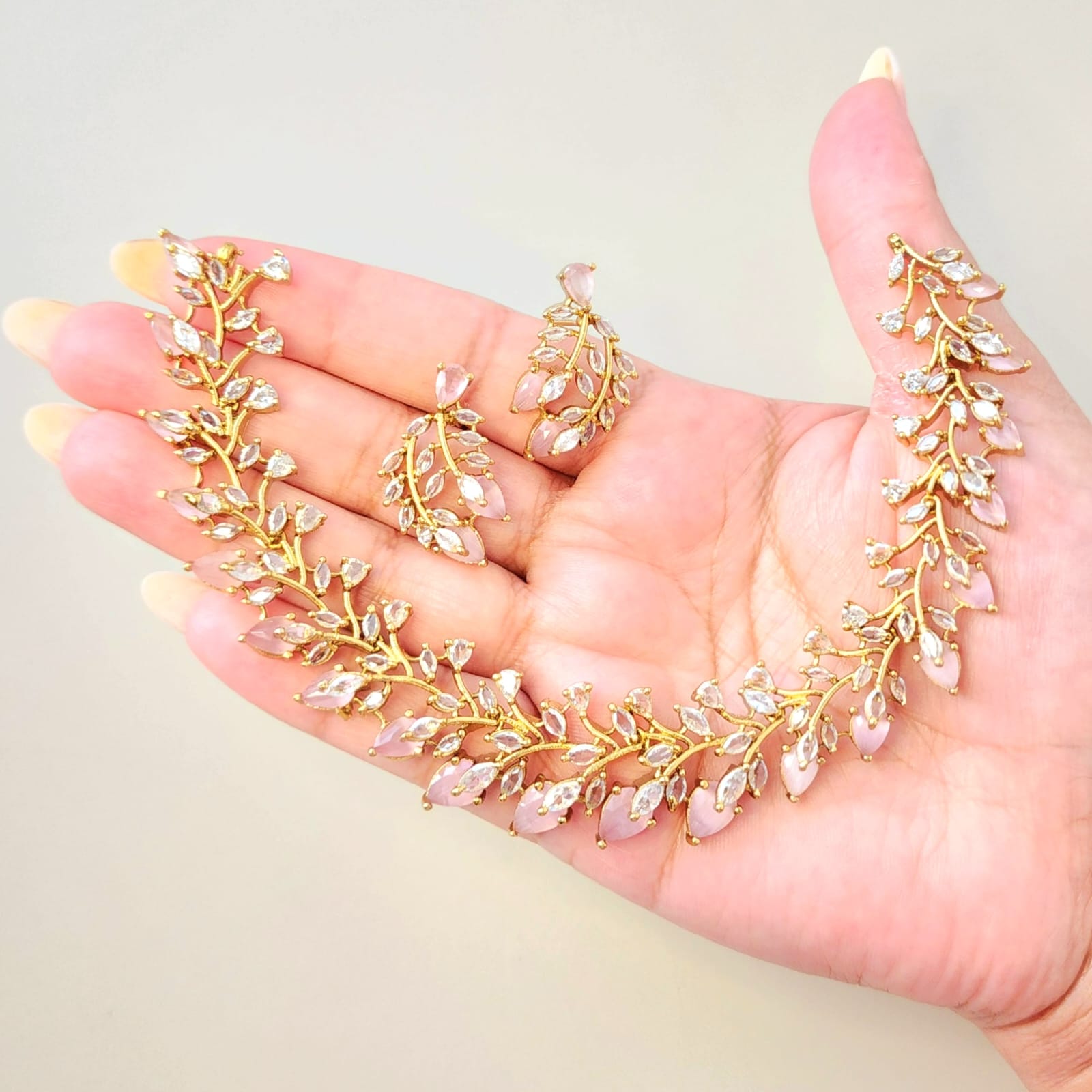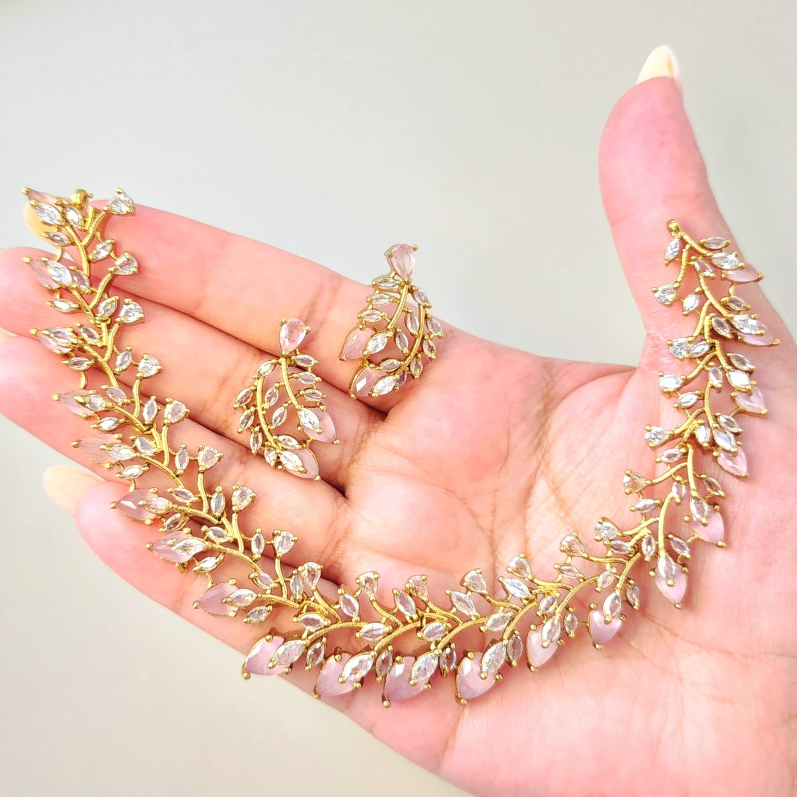 Turn heads with the Blush Elegance Necklace Set, a graceful fusion of modern shimmer and timeless charm. Exclusively from Eclat Indian Jewels, this gold-toned ensemble is adorned with premium CZ diamond simulants and delicate pink stones, arranged in a flowing leaf-inspired design that radiates sophistication.