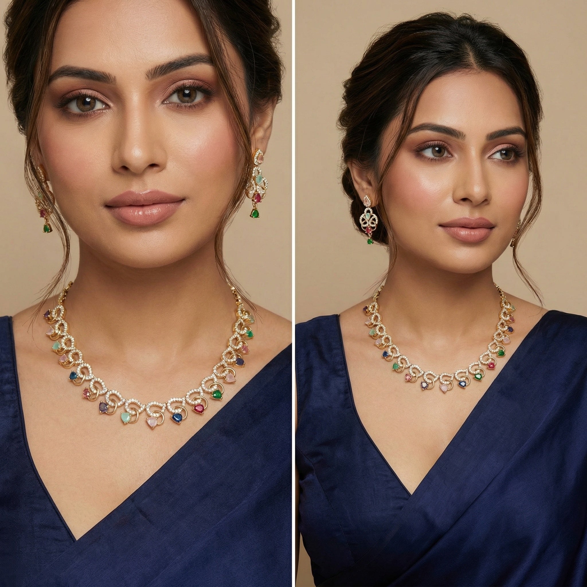 Experience the perfect balance of luxury, brilliance, and timeless elegance with this exquisite Diamond Simulant Necklace Set from Éclat Indian Jewels. Designed for women who appreciate refined craftsmanship, this set features premium‑grade diamond simulants that capture the fire, clarity, and sparkle of real diamonds. Each stone is expertly cut to maximise light reflection, giving the necklace a radiant, high‑end finish that stands out beautifully in photographs and in person.