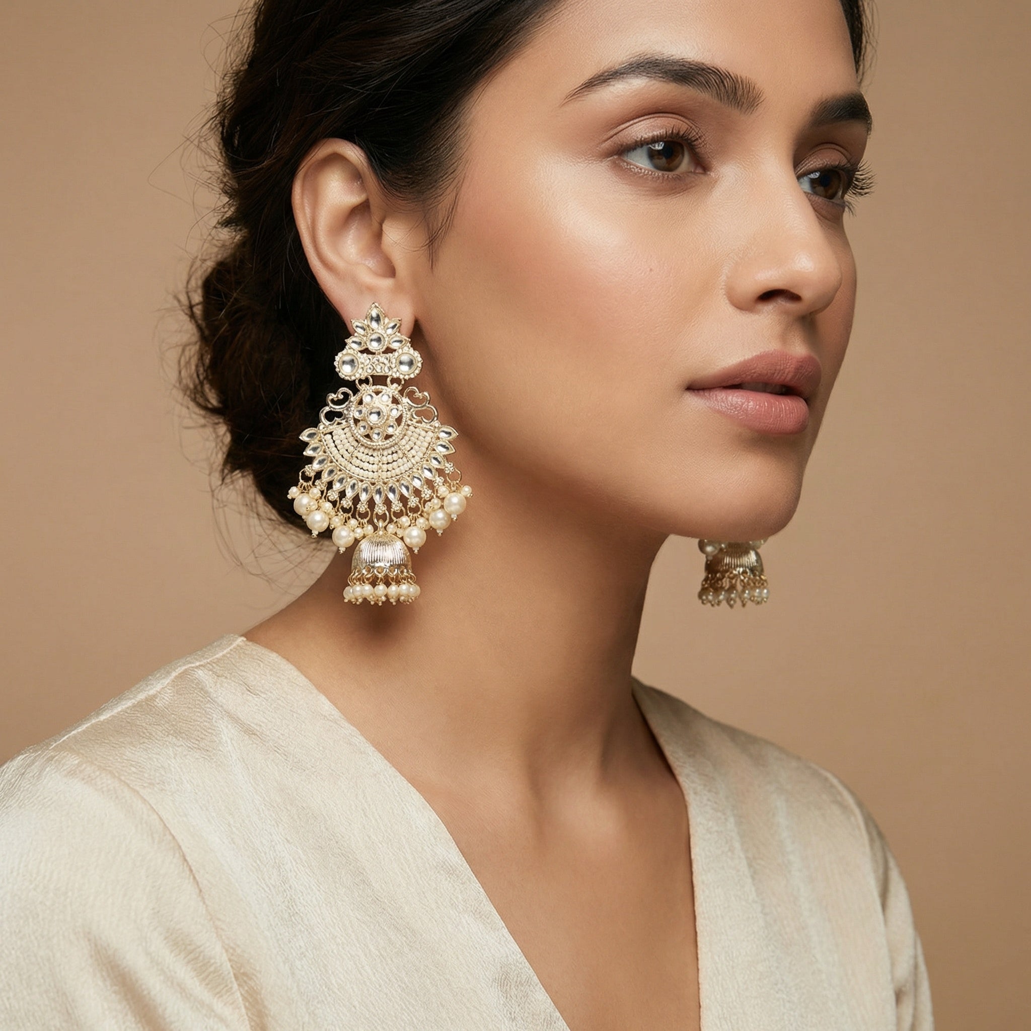 These long jhumki earring takes the elegance of this classic design to the next level. Made from gold-plated finish, it's a piece of art that showcases the perfect blend of traditional and contemporary styles.The hair chain is detachable and can be paired with other earrings as well. The 8.5 cm length of this earring is perfect for adding a touch of glamour to any traditional outfit. It's an Indian jewel that exudes an éclat that is hard to match. Don't miss out on this stunning piece of jewellery and add it to your collection today!
