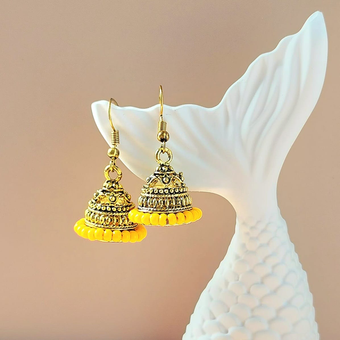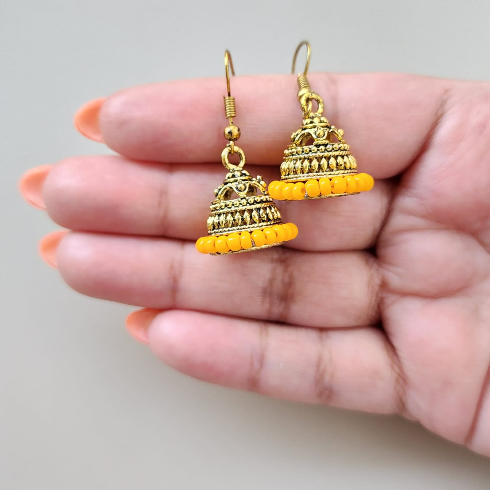 Introducing the exquisite Mini Jhumkas from Eclat Indian Jewels, a perfect blend of traditional charm and modern elegance. These stunning earrings feature a vibrant gold dome adorned with intricate golden floral motifs, adding a touch of whimsy and sophistication. The base of the jhumkis is embellished with a fringe of lustrous yellow pearls, creating a beautiful contrast and enhancing the overall allure. The earrings are designed with a gold-toned hook for easy wear and a secure fit. These mini jhumkas are ideal for adding a pop of color and a hint of tradition to any outfit, making them a versatile addition to your jewellery collection. Embrace the essence of traditional Indian jewelry and buy Indian jewellery online from Eclat Indian Jewels to add a touch of timeless beauty to your collection.